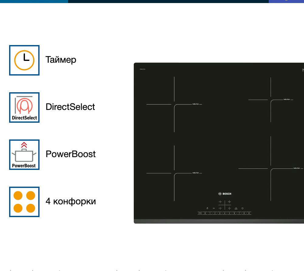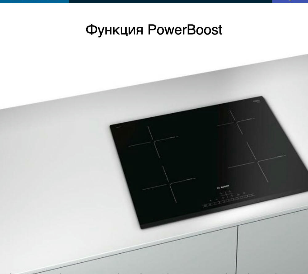 Выбор из 17 ступеней мощности позволит точно отрегулировать нагрев, а сенсорное управление DirectSelect обеспечит комфорт при настройке прибора. Если вдруг понадобится увеличение мощности (например, нужно быстро нагреть большой объем воды), то к вашим услугам режим PowerBoost, на короткий срок усиливающий нагрев одной конфорки за счёт другой, неработающей.