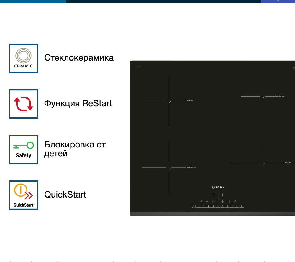 Различные дополнительные опции сделают эксплуатацию прибора удобной и простой. С помощью функции QuickStart расположение посуды на рабочей поверхности определяется сразу после включения. Вам не нужно тратить время на выбор конфорки, просто устанавливайте ступень мощности, и приготовление пищи уже начато.