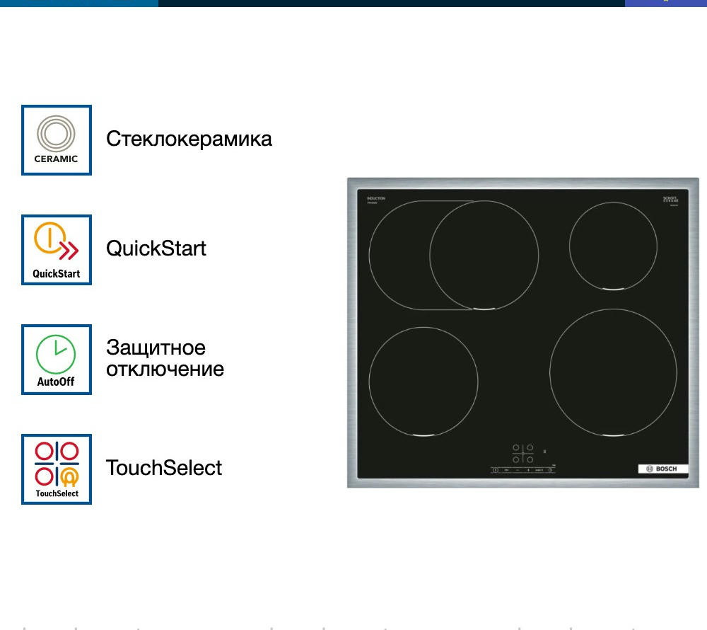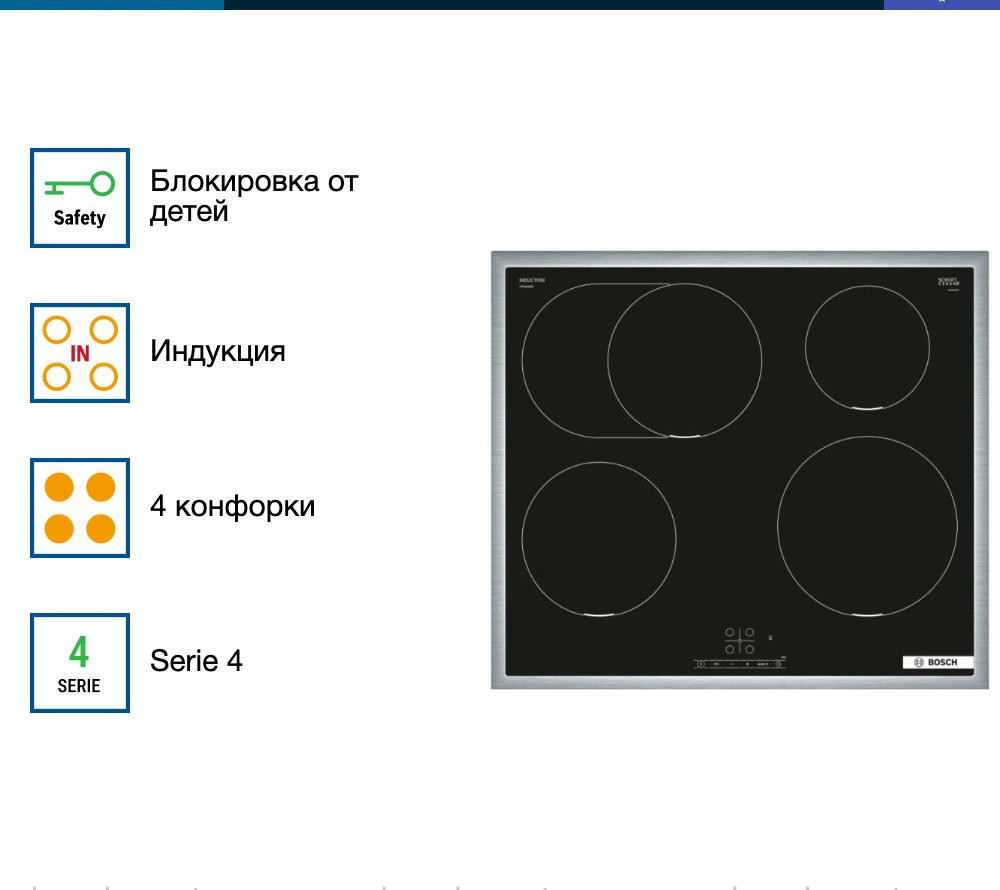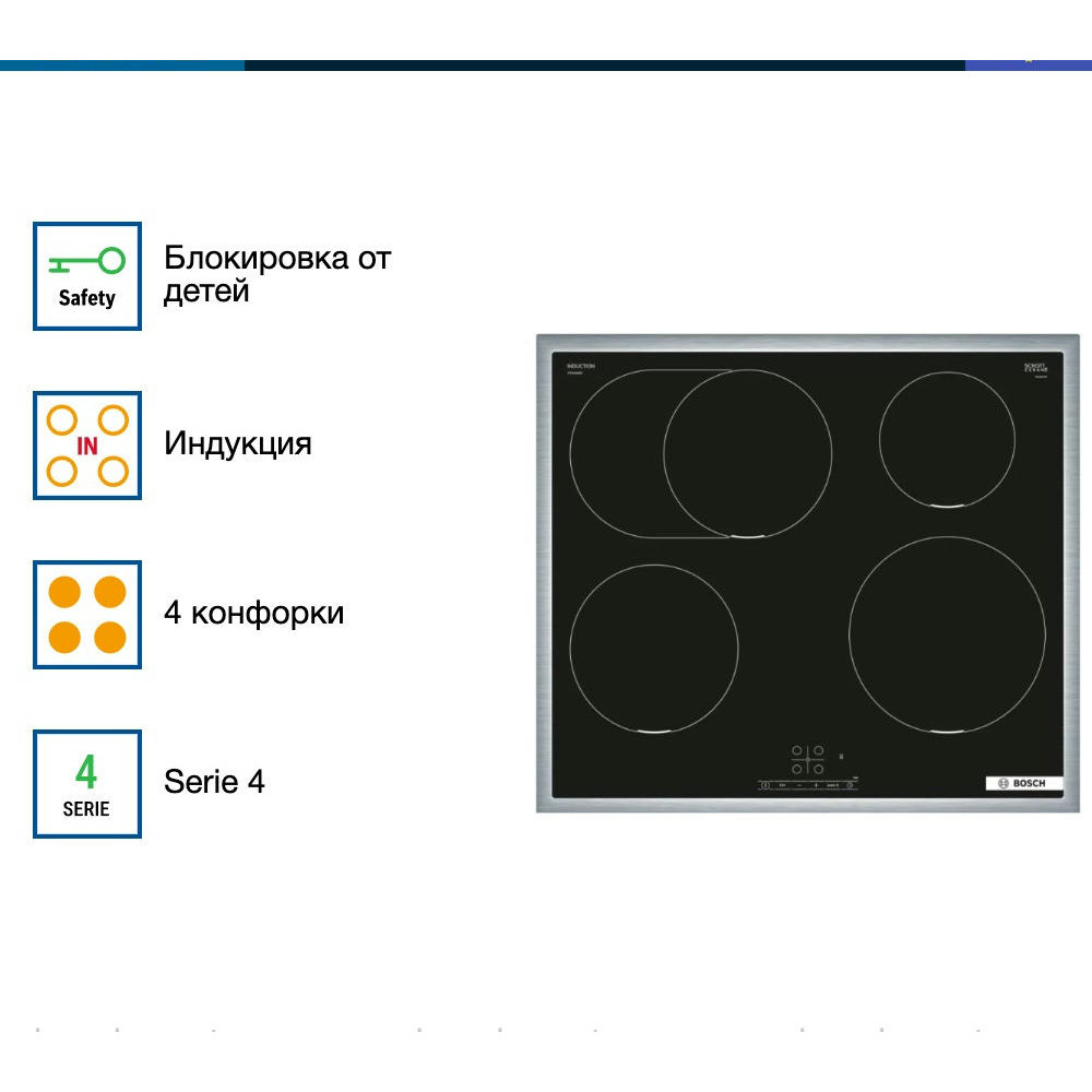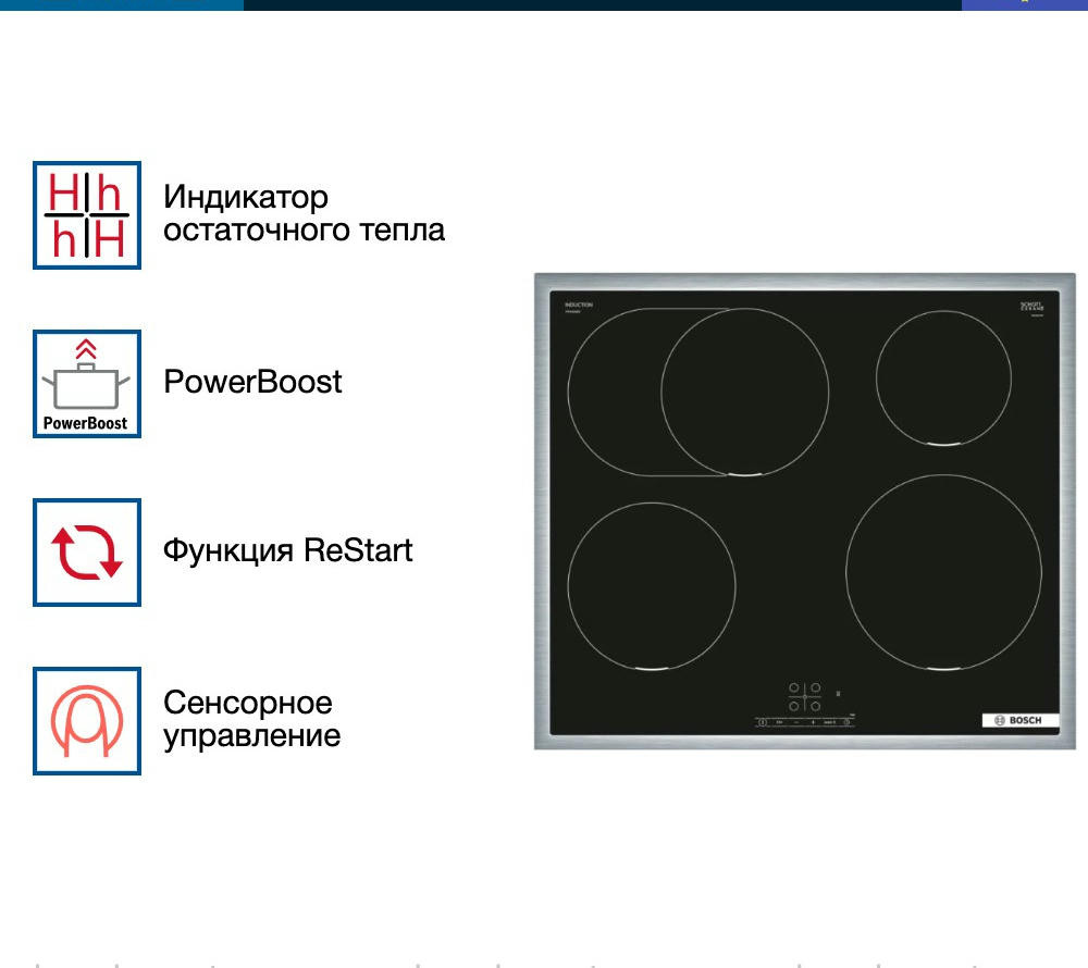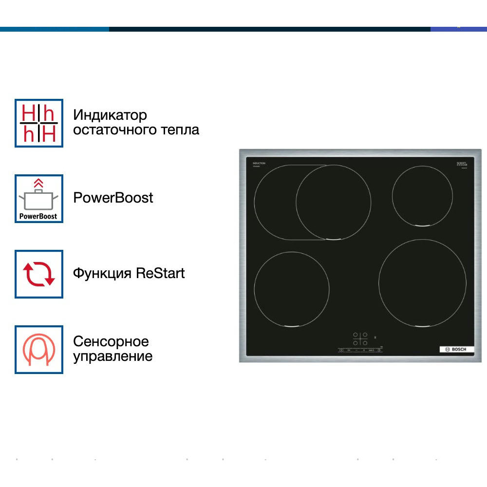 Индукционная варочная поверхность BOSCH PIF645BB5E выполнена в классическом черном цвете с рамкой из нержавеющей стали. Имеет четыре конфорки, одна из которых с зоной расширения, что предполагает готовку в овальной посуде. PowerBoost поможет быстро разогреть еду или вскипятить воду. Сенсорная панель управления облегчит эксплуатацию прибора. Функция защитного отключения предотвратит перерасход электроэнергии и обезопасит ваш дом. Устройство оснащается специальным датчиком, который выключает нагрев, если в течение определённого времени от пользователя не поступает никаких команд.