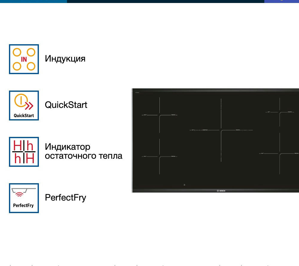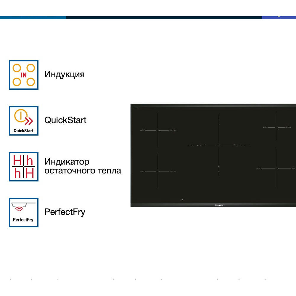 Варочная панель Bosch PIV975DC1E — это пять высокоэффективных зон нагрева и большой функционал. Широкая модель позволяет расположить большое количество предметов. Таймер с функцией выключения автоматически отключает индукционную конфорку по истечению заданного времени, что повышает уровень комфорта и обеспечивает безопасное использование. Сенсор жарения PerfectFry — это идеальное поджаривание продуктов до оптимального состояния.