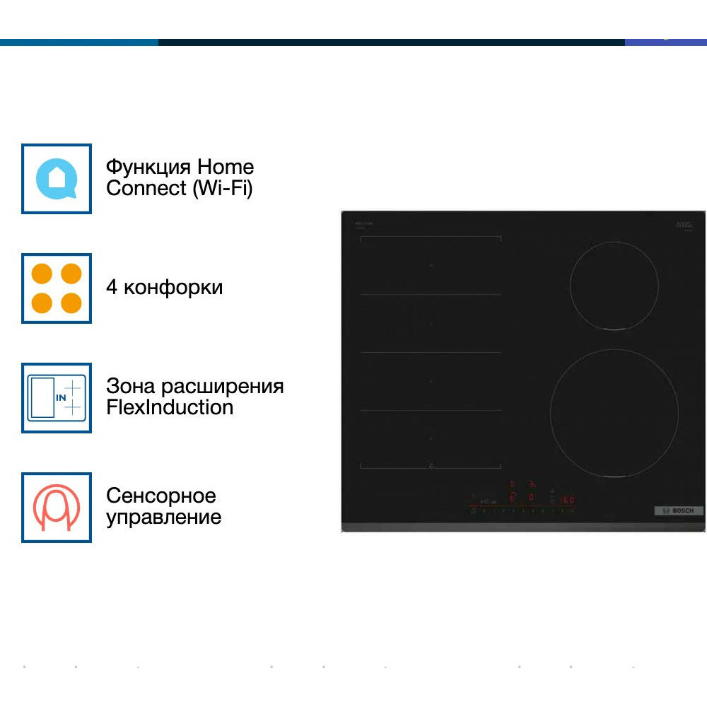 Управление панелью осуществляется с помощью сенсорных кнопок системы TouchSelect, что делает процесс управления интуитивно понятным и удобным. На TFT дисплее отображается вся необходимая информация, включая уровень мощности и время работы. Кроме того, модель оборудована таймером с функцией отключения для каждой конфорки, что позволяет контролировать процесс приготовления и избежать пережаривания или пригорания блюд. Особенностью данной модели является наличие зоны расширения FlexInduction, которая позволяет использовать любую посуду без ограничений по размеру. Это очень удобно при приготовлении больших порций или использовании нестандартной посуды. Также стоит отметить функции PanBoost и PowerBoost, которые позволяют увеличить мощность конфорок для быстрого нагрева. Варочная панель оборудована защитным отключением, блокировкой от детей и индикатором остаточного тепла, обеспечивающими безопасность использования. Соединение с Home Connect позволяет управлять панелью дистанционно через смартфон или планшет.