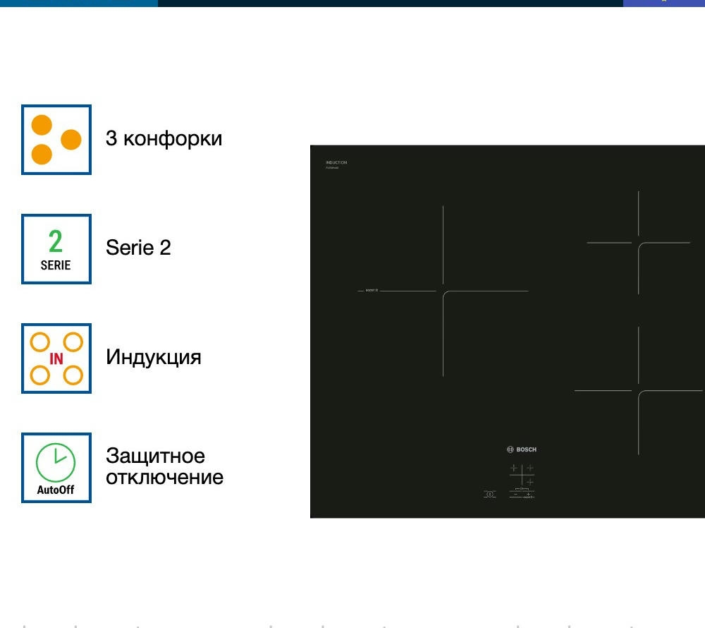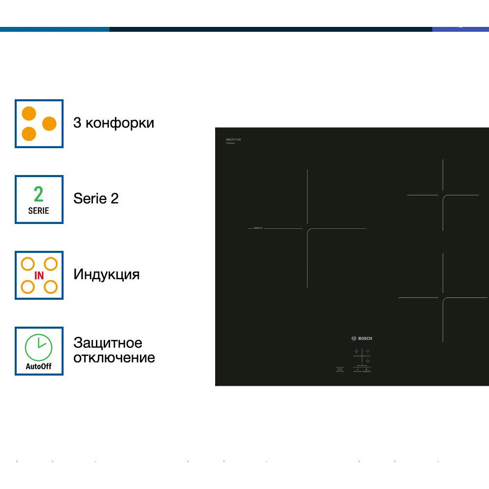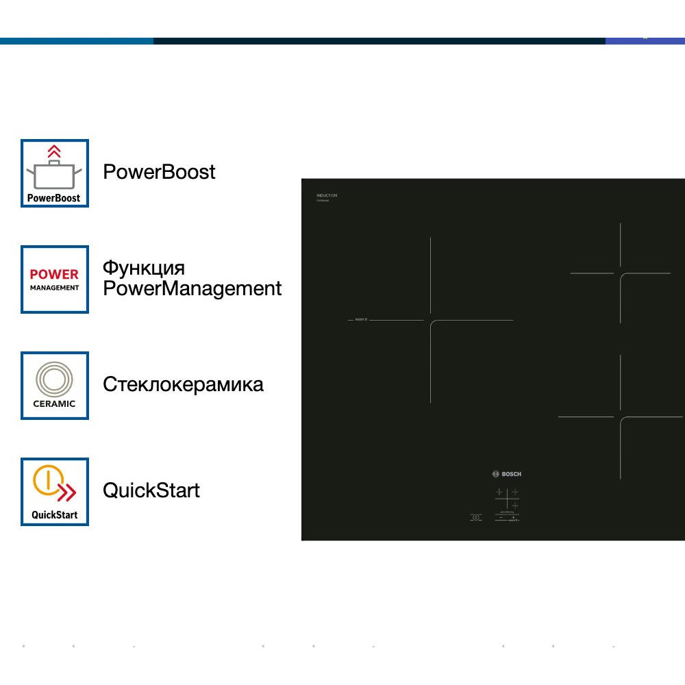 Индукционная варочная панель Bosch PUC61KAA5E обеспечит быстрый нагрев и простоту в обслуживании. Функция PowerBoost - сокращение времени приготовления. Блокировка от детей защитит панель от нежелательного включения. Индукция быстро и точно нагревание, легкость очистки и низкое энергопотребление. Функция QuickStart: точное определение положения кастрюли