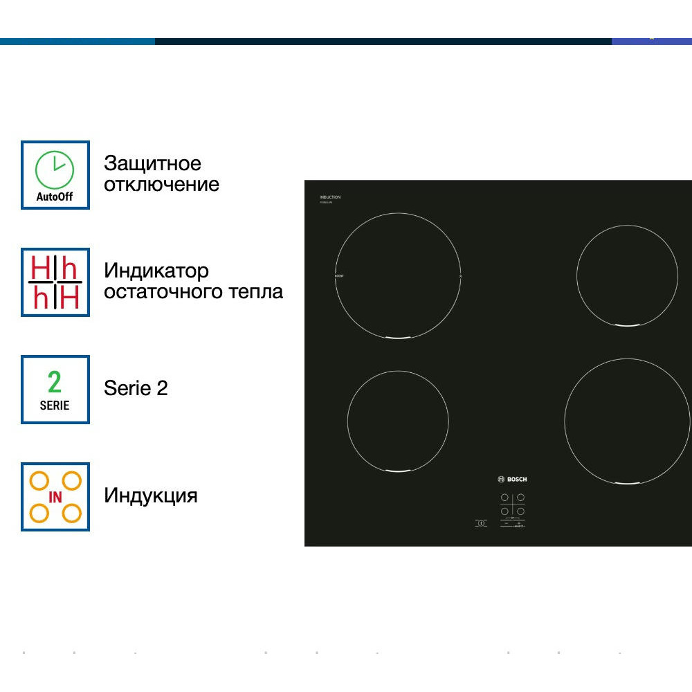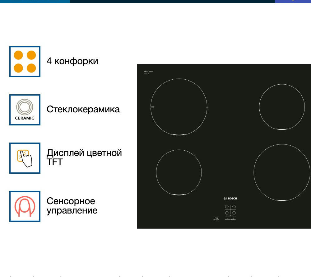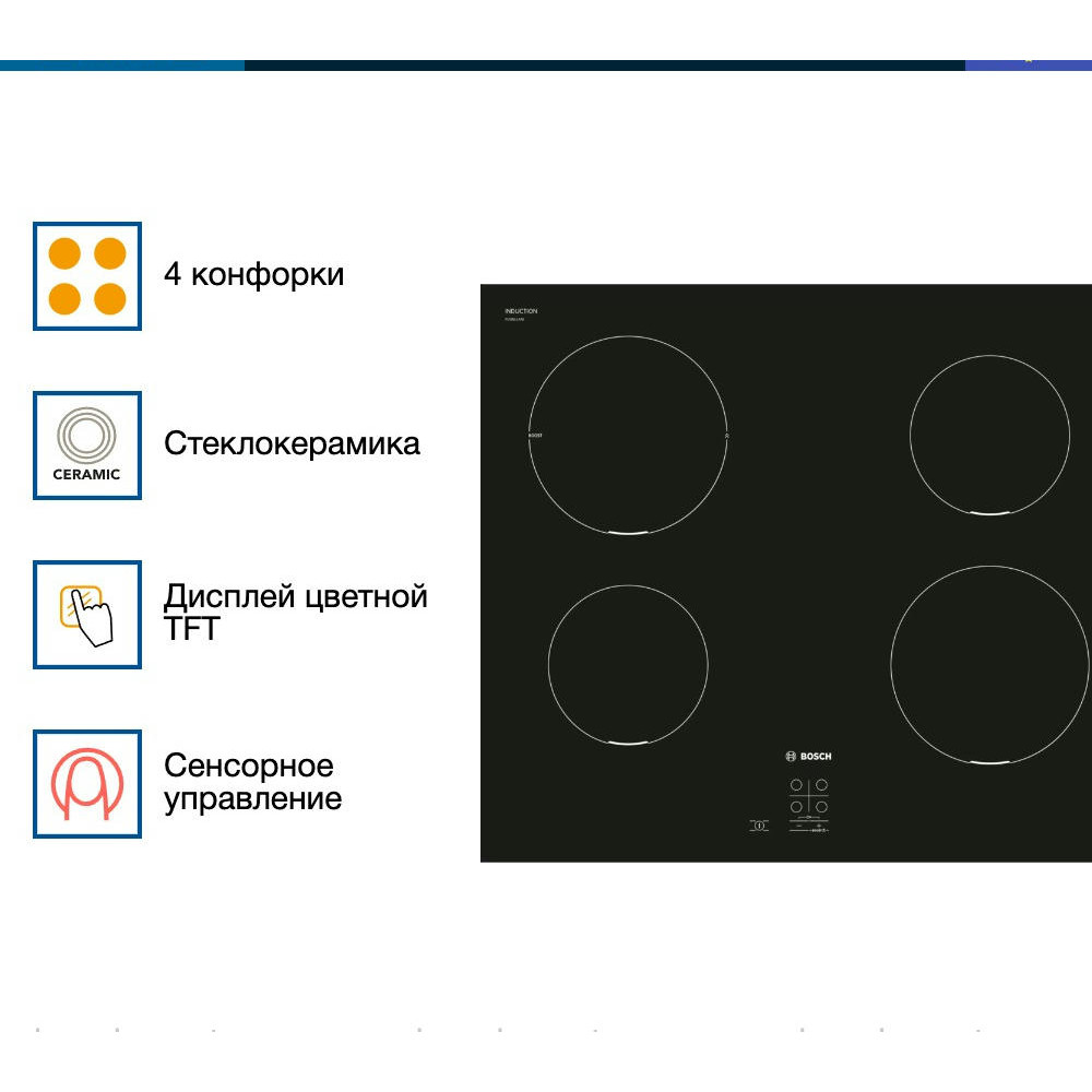 Варочная панель BOSCH PUC611AA5E представлена в черном цвете. Она выполнена из стеклокерамики — такой материал характеризуется устойчивостью к температурному и химическому воздействиям, а также долгим сроком эксплуатации.