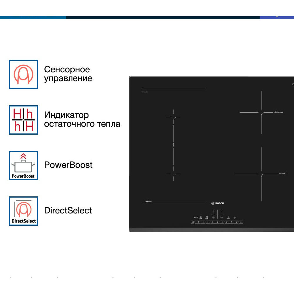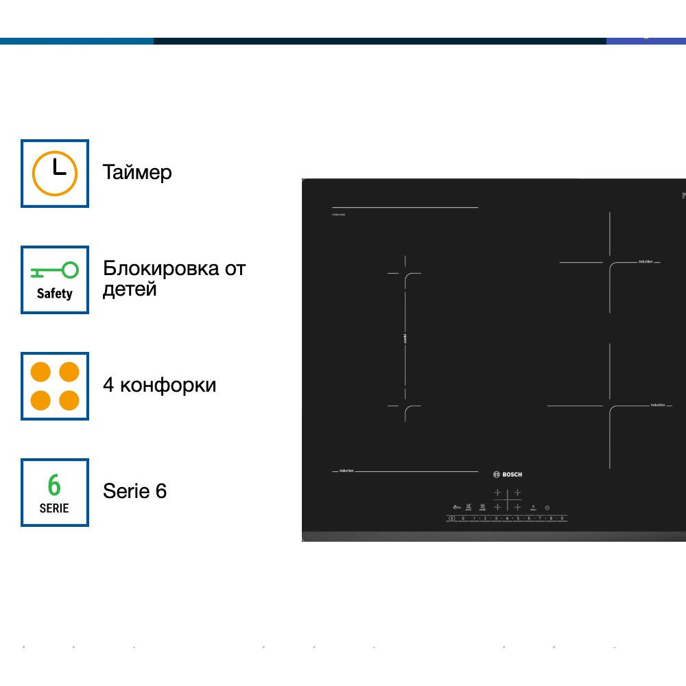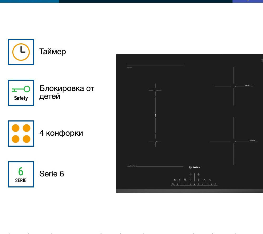 Варочная панель Bosch PVS631FB5E оснащена функцией PowerBoost, она повышает мощность нагрева до 50%, вы можете быстрее вскипятить воду. Таймер оснащен технологией отключения для каждой конфорки, можно выставить время для готовки. При выключении устройства, ваши настройки восстановятся при следующем запуске.