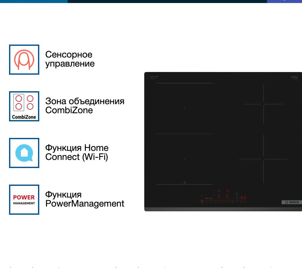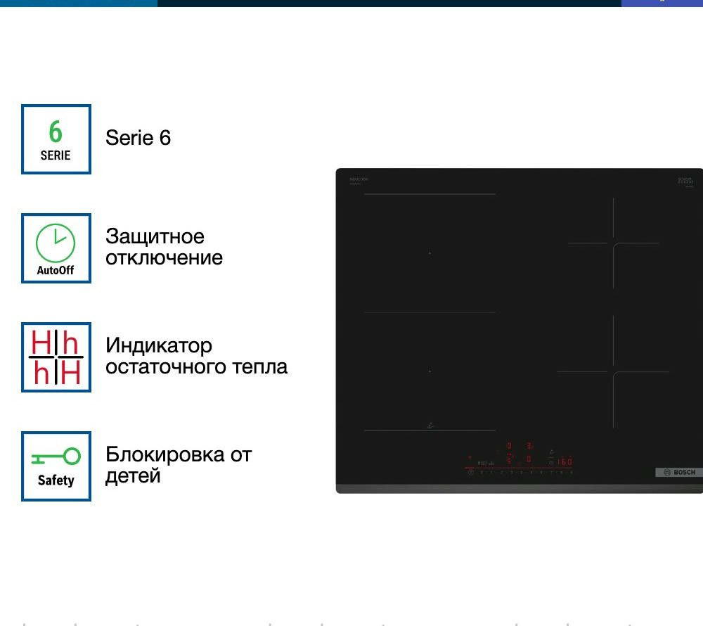 Индукционная варочная панель Bosch PVS63KHC1Z — это сочетание современных технологий, эффективности и стильного дизайна. Произведенная в Евросоюзе, она предлагает качество и надежность, которые стали визитной карточкой бренда Bosch. Серия Serie | 6 представляет собой элегантное черное стеклокерамическое покрытие, которое придает панели современный и элегантный вид. Прямые и скошенные края добавляют дополнительной элегантности и утонченности. Устройство оснащено четырьмя конфорками, которые обеспечивают равномерное и быстрое нагревание. Функция распознавания посуды автоматически определяет размер и форму посуды, обеспечивая оптимальное использование энергии. Сенсорное управление TouchSelect позволяет легко и точно регулировать уровень нагрева каждой конфорки, а TFT дисплей обеспечивает ясное и четкое отображение всех настроек. Система управления панелью обеспечивает максимальную функциональность и удобство использования. Функции QuickStart и ReStart обеспечивают быстрый старт и перезапуск панели, в то время как функция PowerBoost позволяет мгновенно увеличить мощность нагрева для быстрого приготовления пищи. Функция PowerManagement помогает экономить энергию, а режим MoveMode позволяет легко перемещать посуду по поверхности панели. Зона объединения CombiZone позволяет объединять две конфорки в одну большую для приготовления блюд в больших сосудах. Таймер с функцией отключения для каждой конфорки обеспечивает точность приготовления и предотвращает перегрев. Присутствует и функция защитного отключения, блокировка от детей и Cleaning-пауза для удобства и безопасности использования. Индукционная варочная панель Bosch PVS63KHC1Z — это не только практичный, но и стильный элемент интерьера. Ее компактные размеры и элегантный дизайн делают ее идеальным выбором для любой современной кухни.