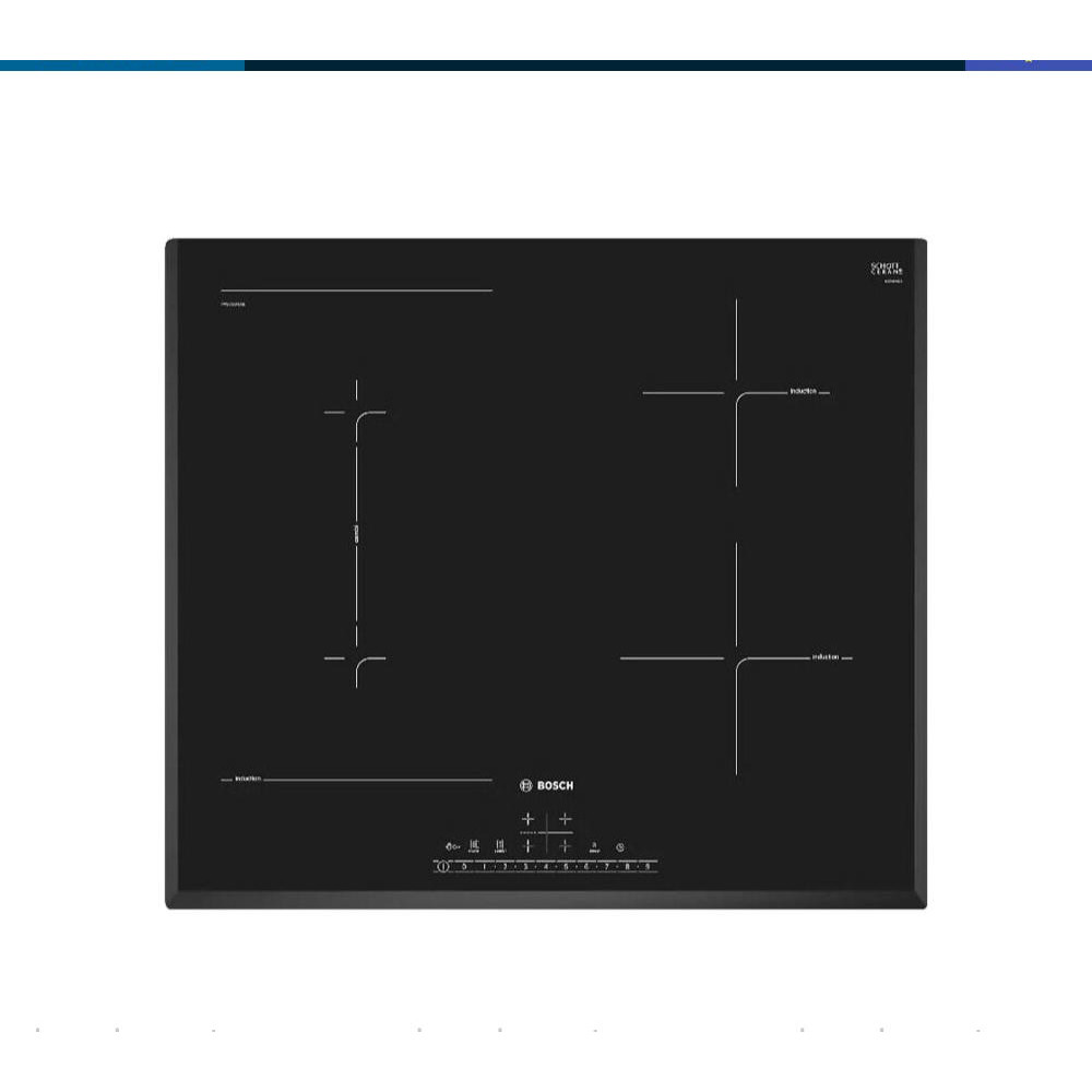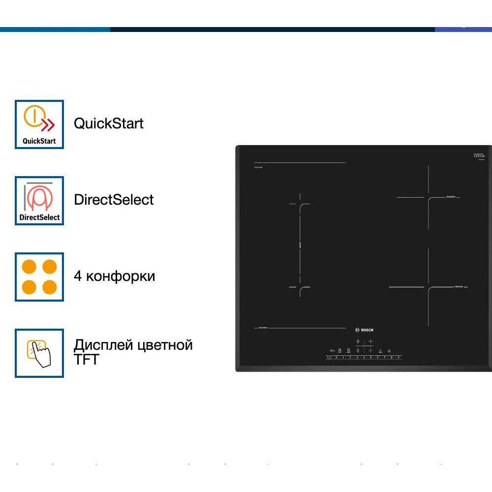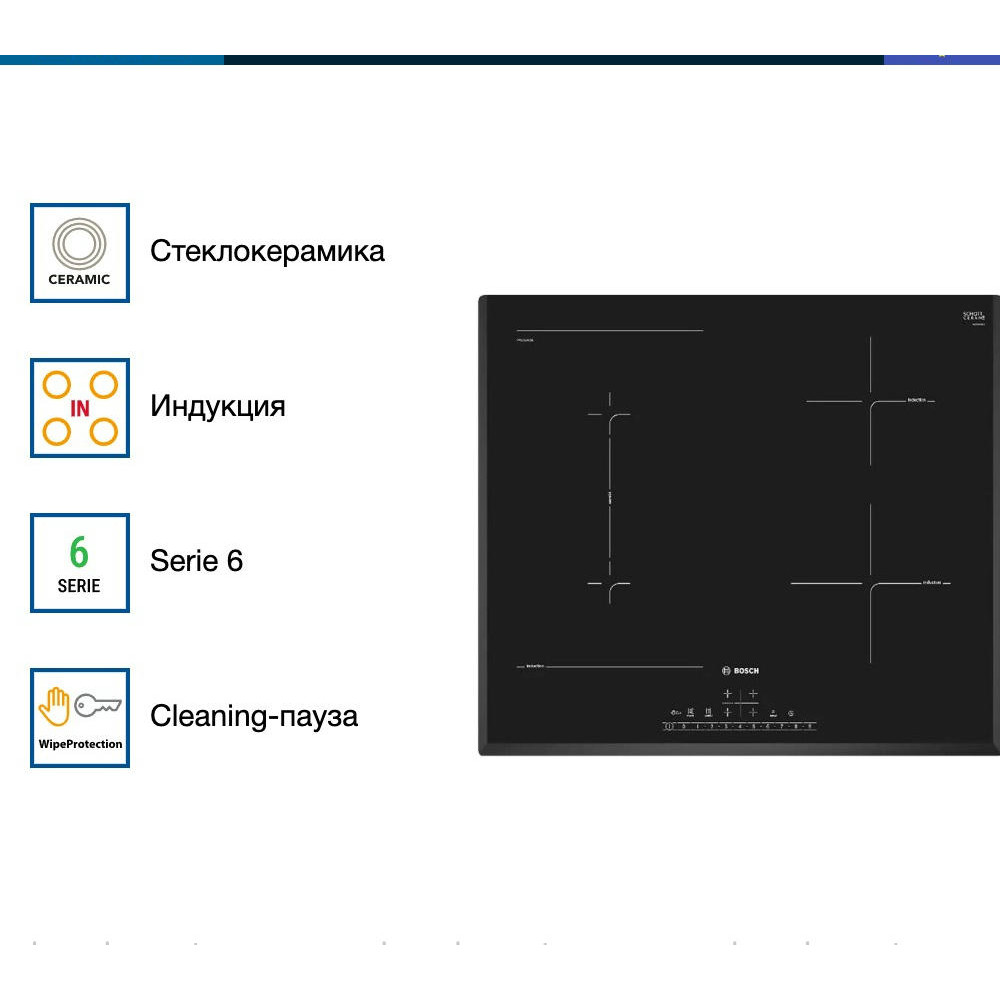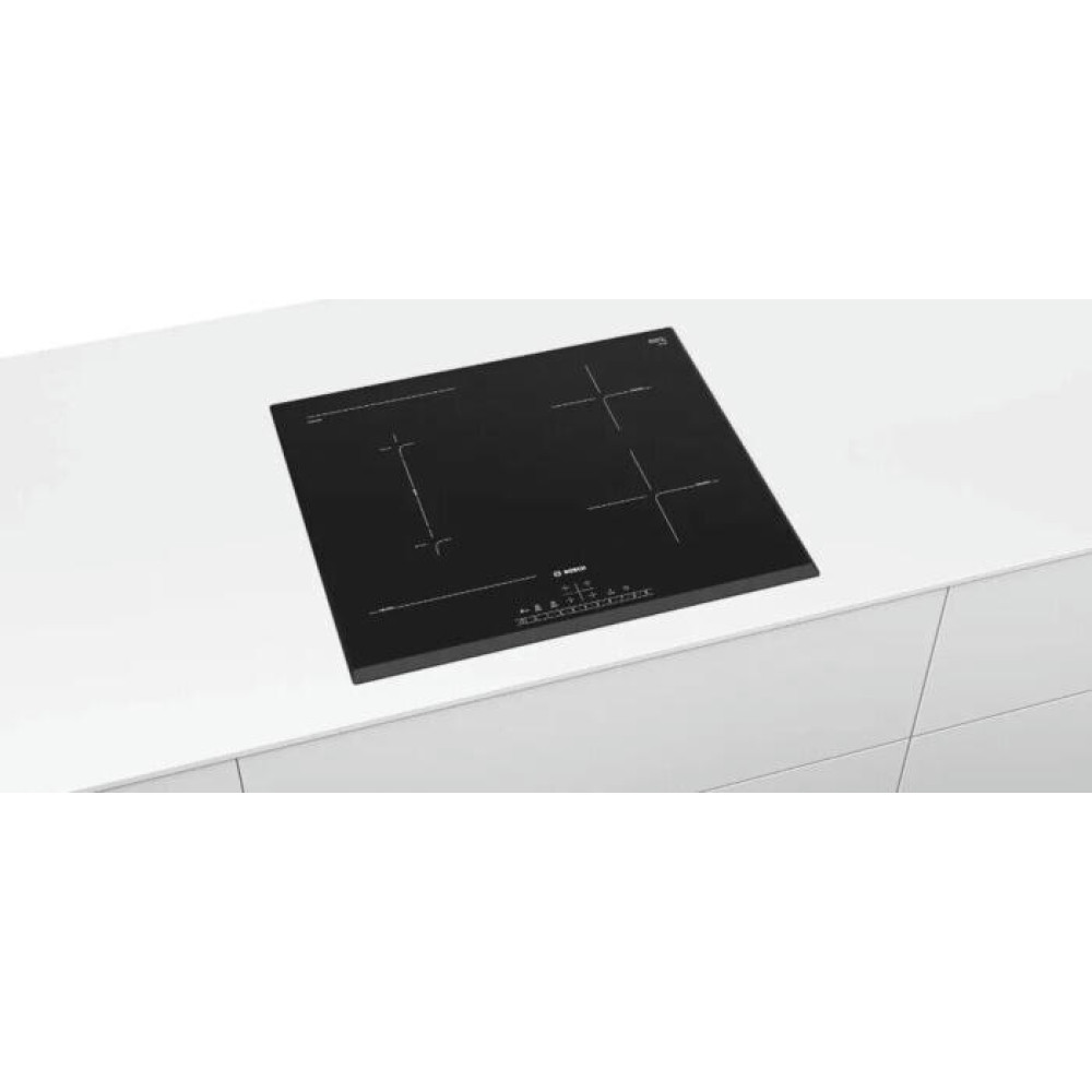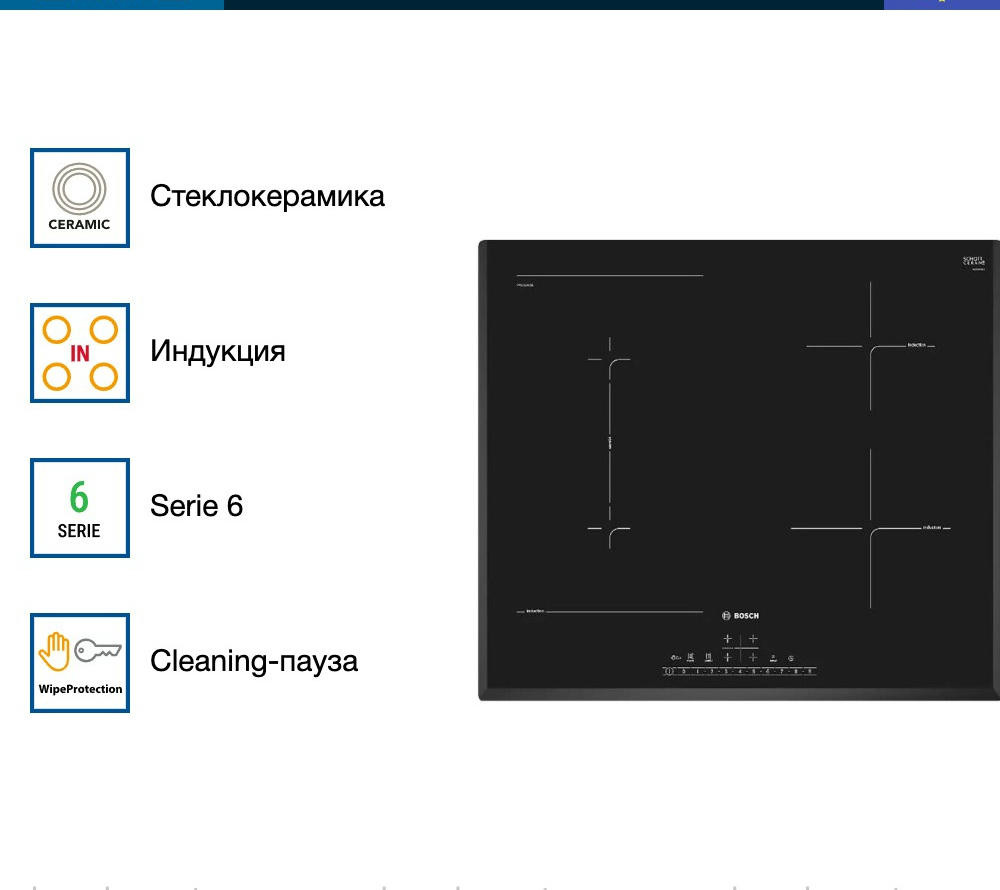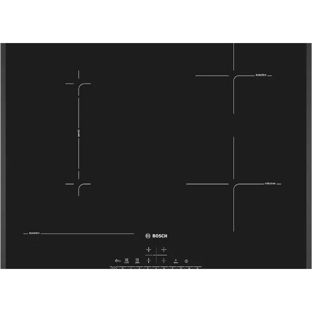 Варочная панель Bosch PVS651FC5E — индукционная модель стандартной формы и ширины. Квадратная, размером 60 на 60 сантиметров, она подойдет и для небольших, и для просторных кухонь. Стеклокерамическая поверхность ровная, ее легко очищать. Достаточно дождаться остывания покрытия и протереть губкой или мягкой тканью с моющим средством, а затем ополоснуть.