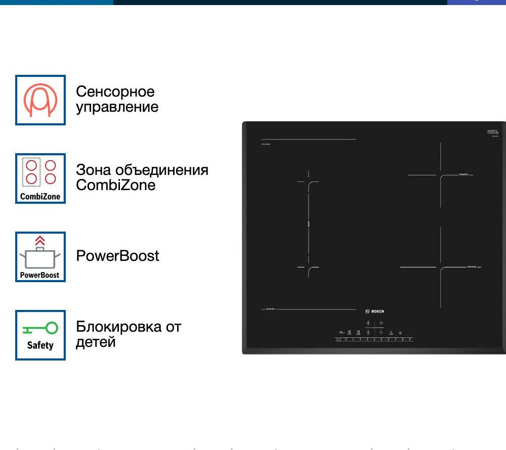 Есть система автоотключения и блокировки панели управления. Даже если вы забудете о том, что на плите готовится какое-то блюдо, оно не подгорит: конфорка выключится. Также можно задать настройки таймера — сигнал напомнит, что нужно подойти к плите. Индикация остаточного тепла покажет, какая часть варочной панели Бош PVS651FC5E еще горячая. Опция PowerBoost кратковременно увеличивает мощность прибора наполовину и сокращает время нагрева на 20%.