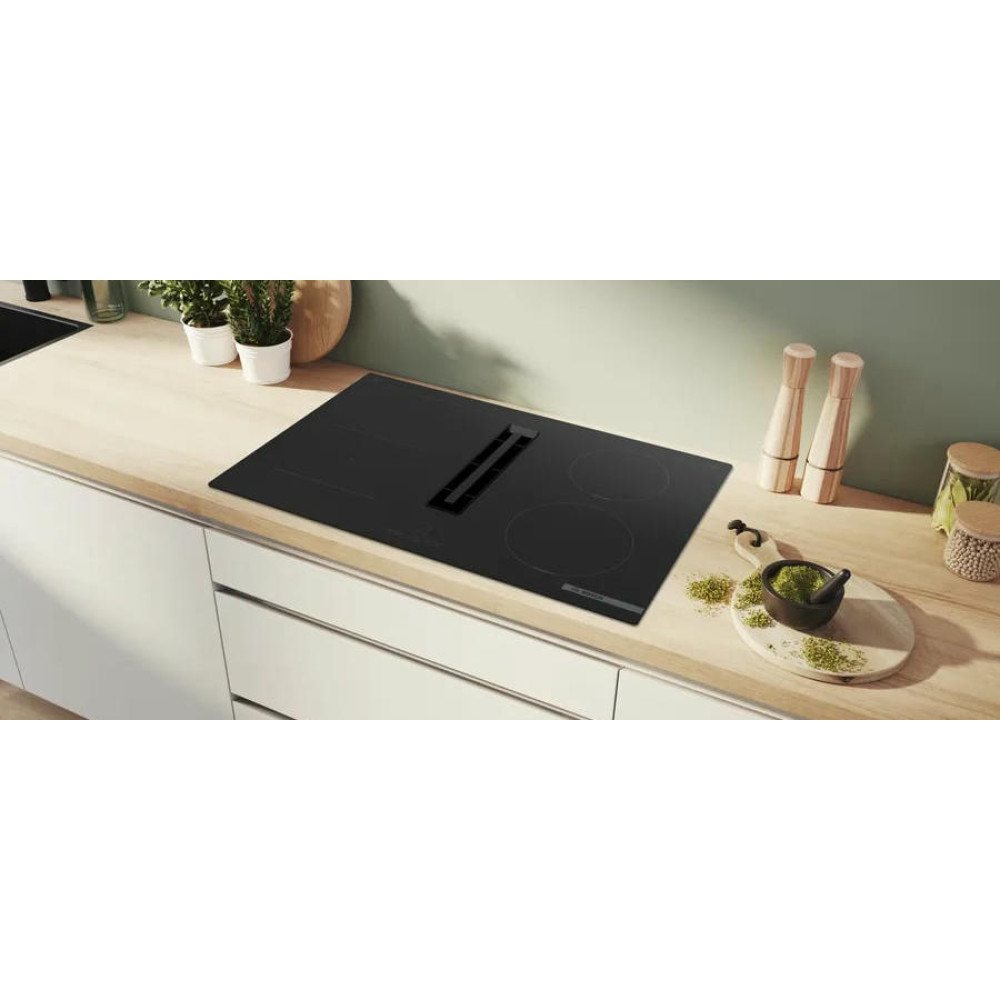 Панель оснащена встроенной вытяжкой, что позволяет избавиться от неприятных запахов и пара при приготовлении. Максимальная мощность в режиме отвода составляет 500 м3/ч. Также имеется режим рециркуляции воздуха. Для безопасности пользователей предусмотрены защитное отключение и блокировка от детей. Панель подключается к сети напряжением 220-240 В и частотой 50-60 Гц. В комплекте с панелью идет сетевой кабель длиной 1.1 м, однако вилка в комплект не входит.