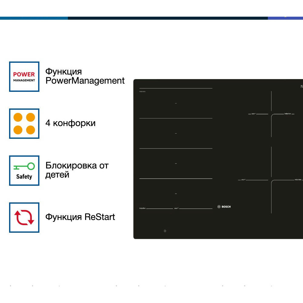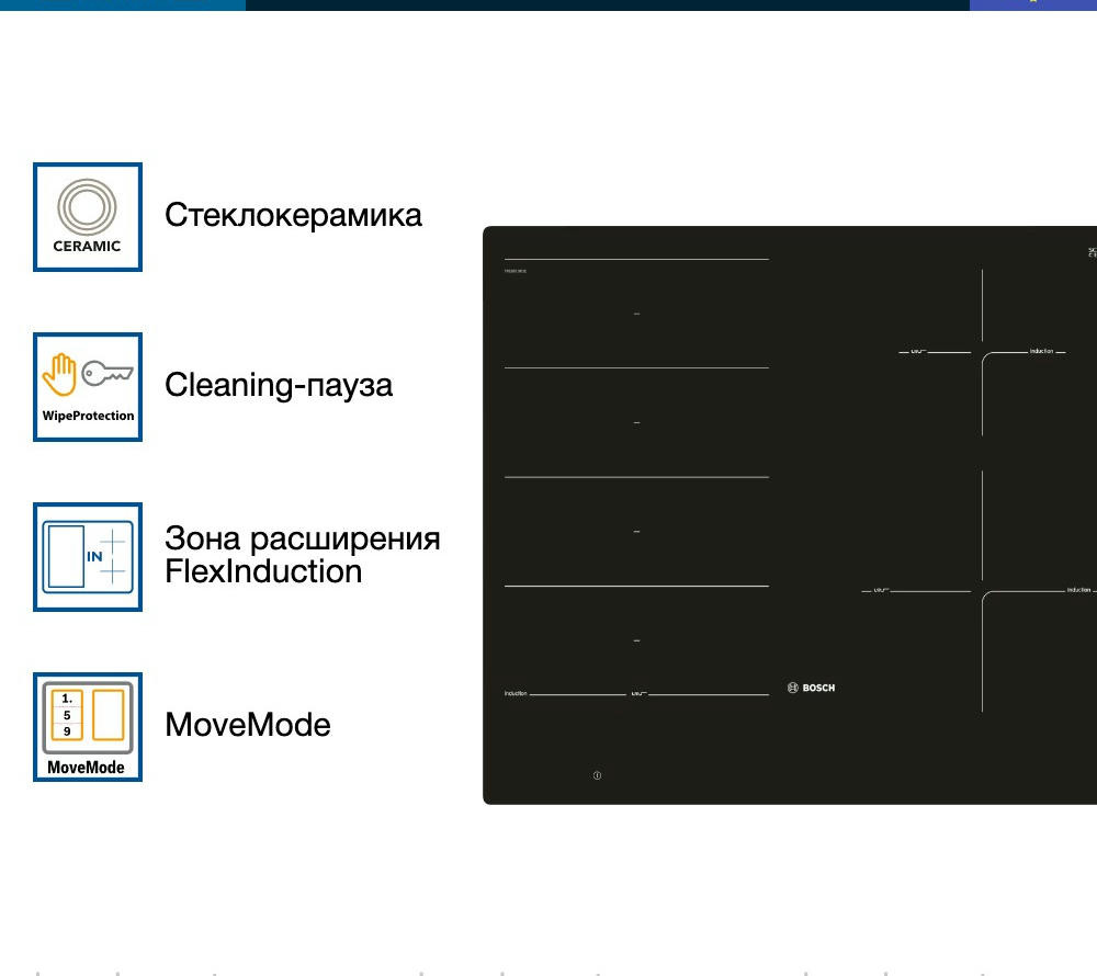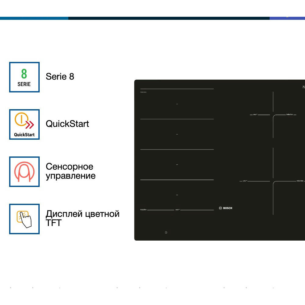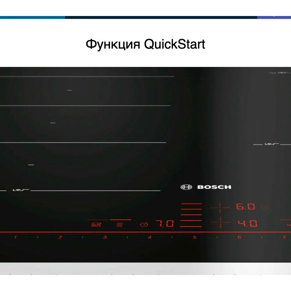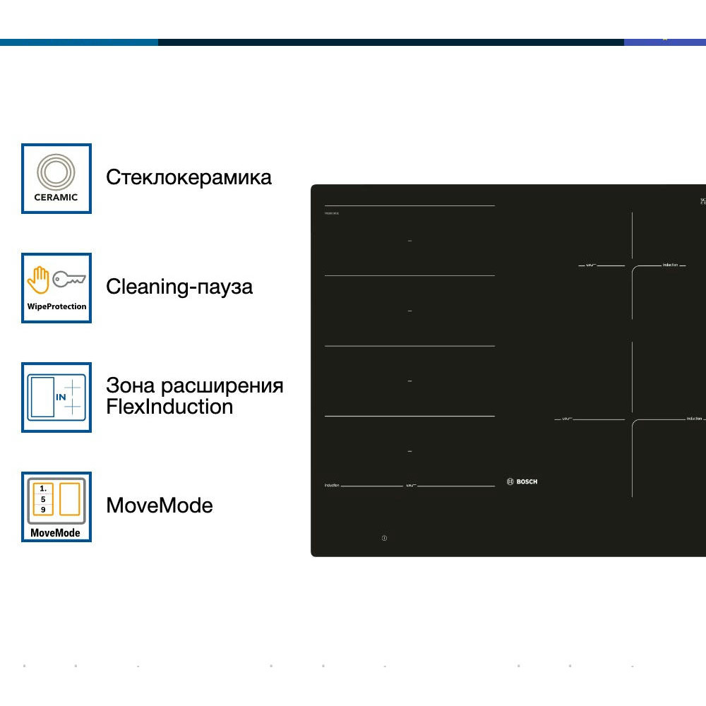Варочная поверхность Bosch PXE601DC1E шириной 60 сантиметров оснащена сенсором PerfectFry с пятью температурными диапазонами. Четыре индукционные зоны нагрева и одна FlexInduction под высококачественной стеклокерамикой SCHOTT CERAN. Панель управления DirectSelect Premium длиной 30 сантиметров позволяет выбрать функцию и уровня нагрева простым касанием пальца. При активации режима MoveMode зона FlexZone делится на три сегмента с предустановленными уровнями 9, 5 и 1.