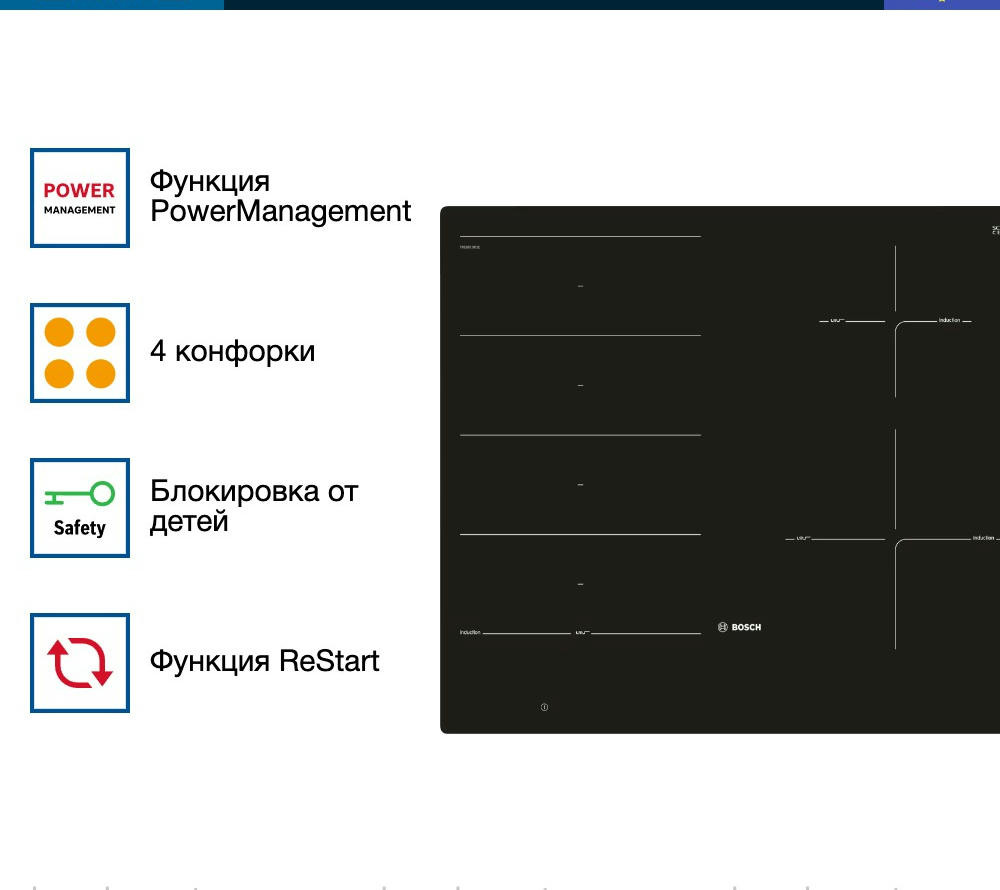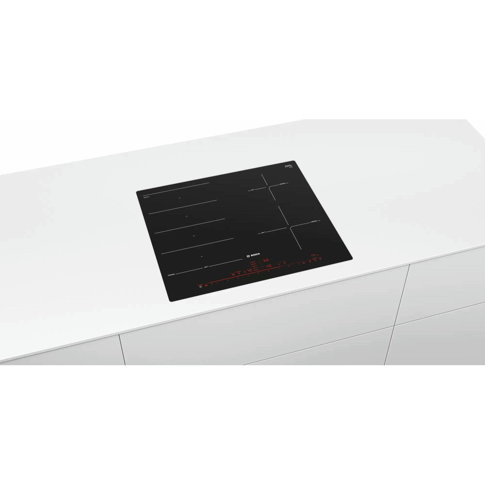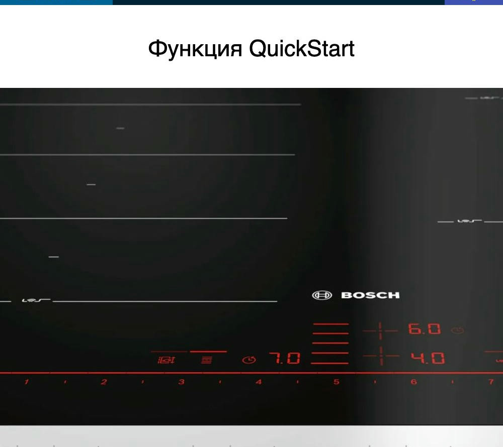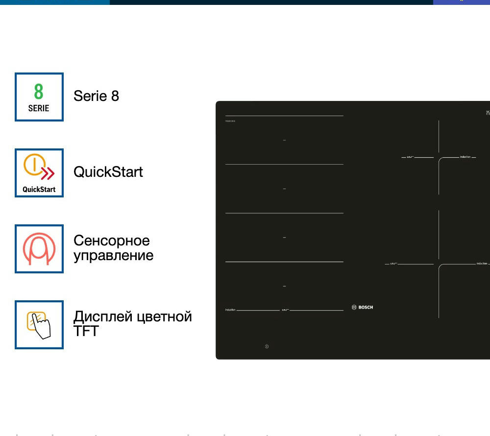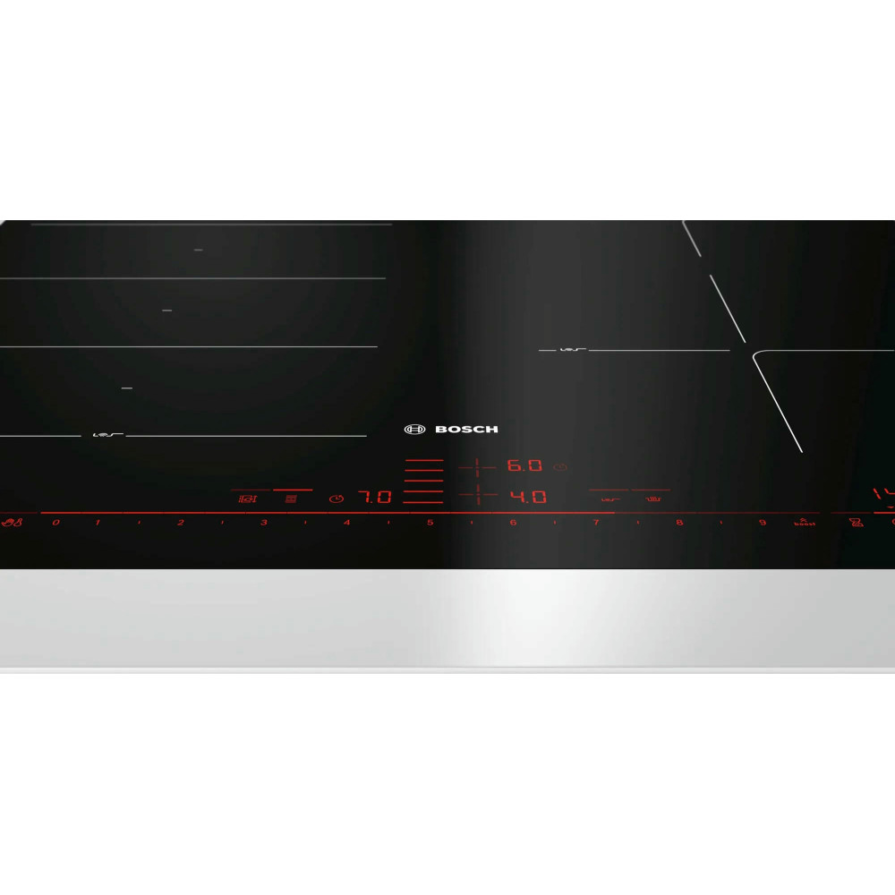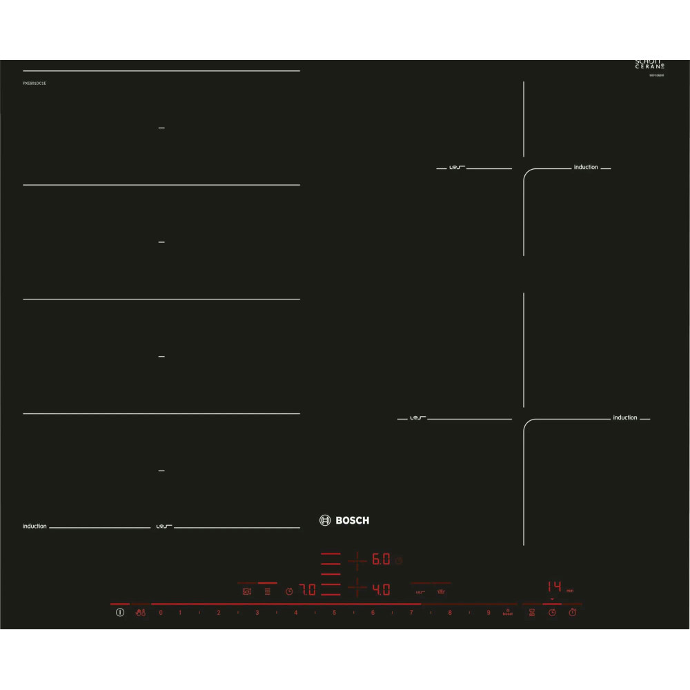 Варочная поверхность Bosch PXE601DC1E шириной 60 сантиметров оснащена сенсором PerfectFry с пятью температурными диапазонами. Четыре индукционные зоны нагрева и одна FlexInduction под высококачественной стеклокерамикой SCHOTT CERAN. Панель управления DirectSelect Premium длиной 30 сантиметров позволяет выбрать функцию и уровня нагрева простым касанием пальца. При активации режима MoveMode зона FlexZone делится на три сегмента с предустановленными уровнями 9, 5 и 1.