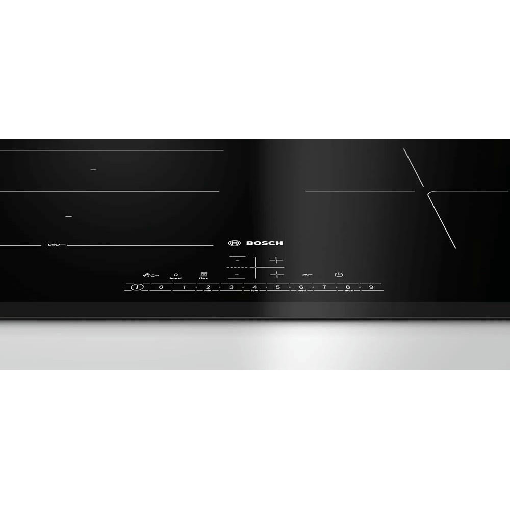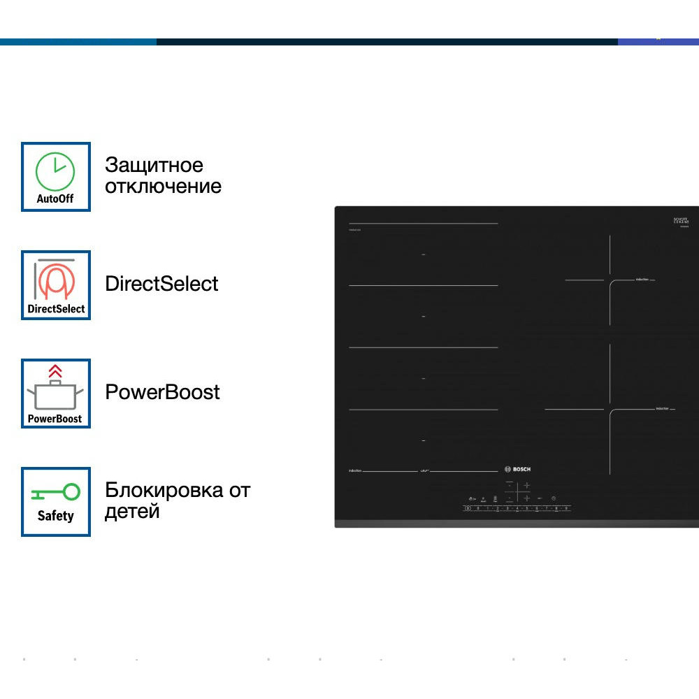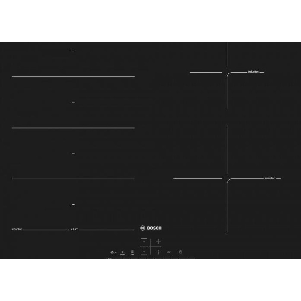 Обратите внимание, как необычно выглядят 4 конфорки. Если вы ставите посуду необычного, большого размера, не стоит беспокоиться о том, что она прогреется неравномерно. При необходимости можно увеличить площадь теплового воздействия. Кроме того, Бош PXE631FC1E позволяет пользоваться на этой поверхности сразу несколькими кастрюлями или сковородками одновременно. На короткое время, например, когда необходимо быстро вскипятить воду, можно активировать функцию PowerBoost, которая увеличит мощность плиты до 50% и уменьшит продолжительность нагрева на 20%.