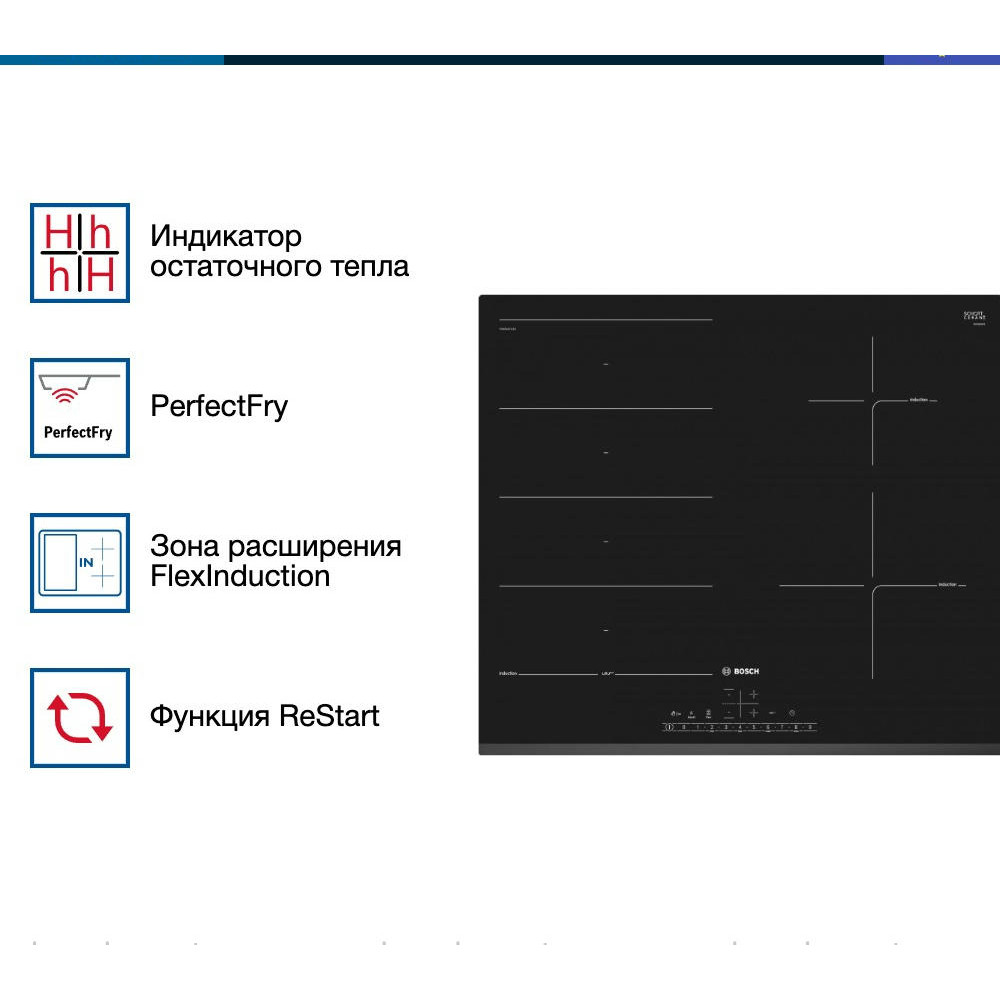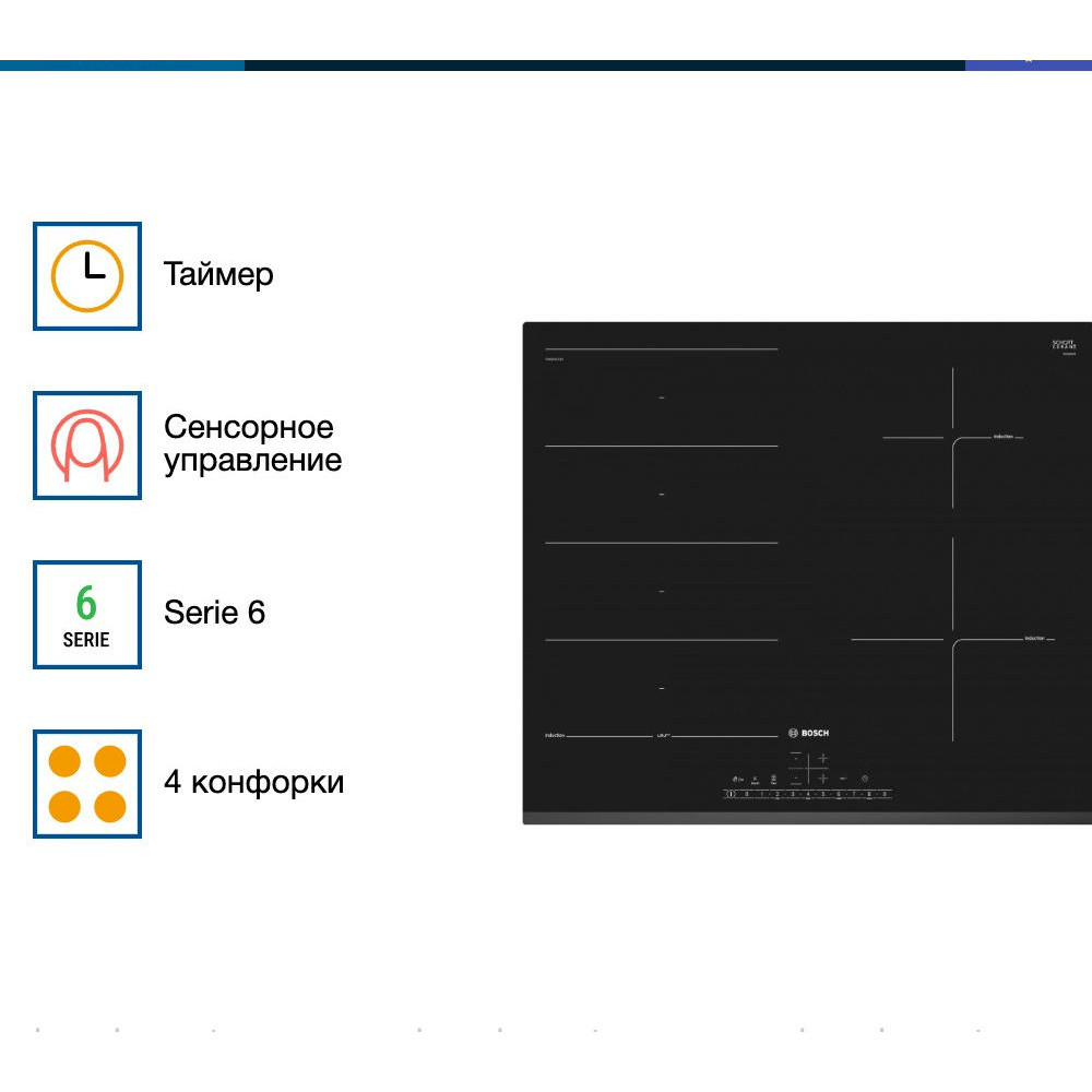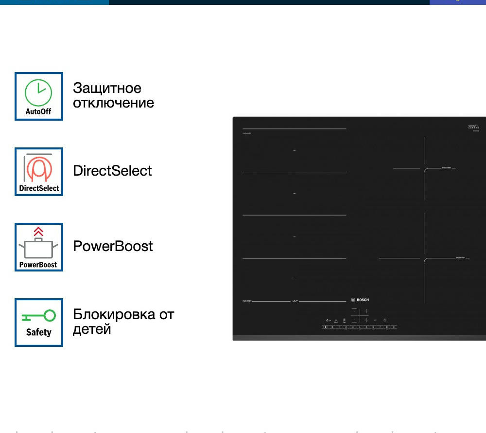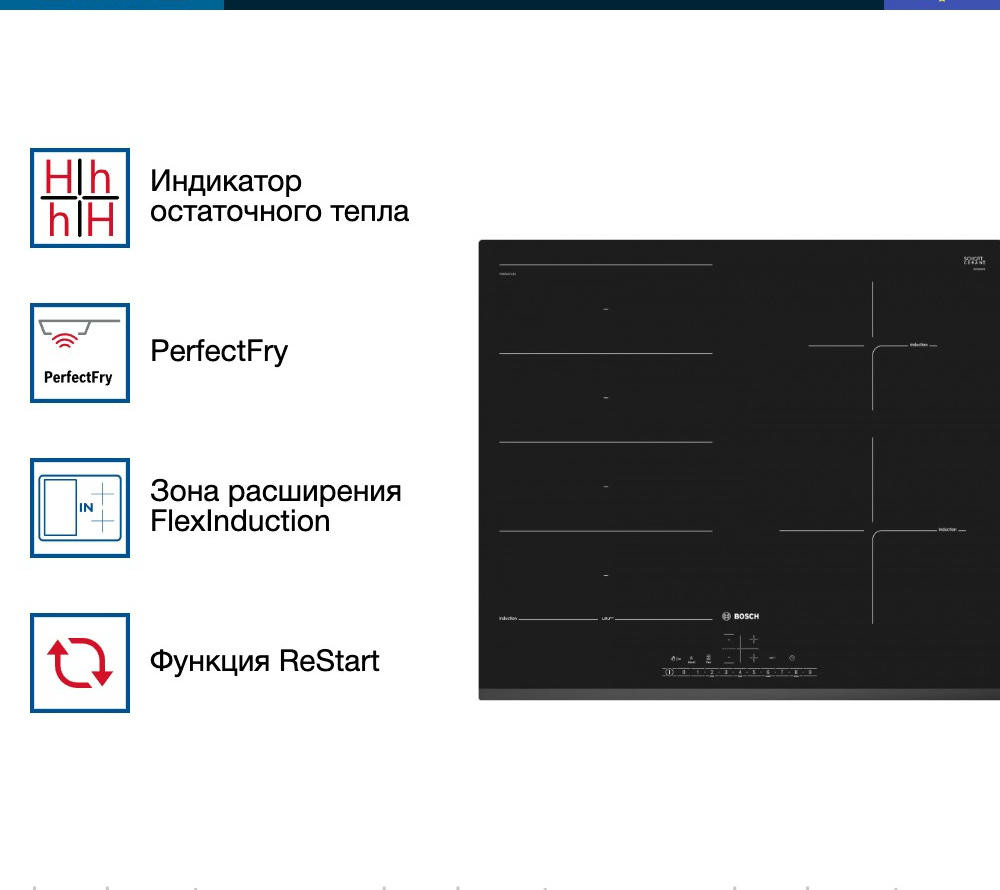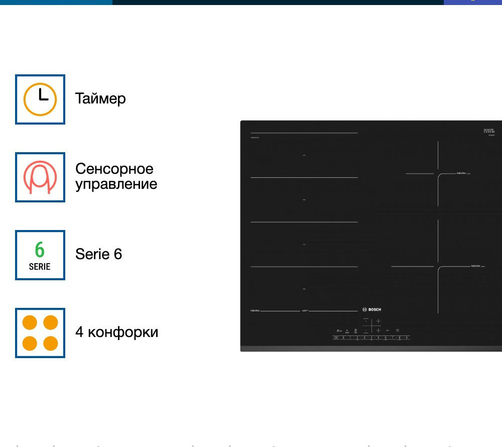 Варочная панель Bosch PXE631FC1E — экономичная современная модель для вашей кухни. Экономия достигается за счет индукции, когда нагревается сама посуда, а не плита. Готовить на ней получается быстрее, чем на электрической. Преимущества такой техники еще и в том, что даже случайно «сбежавшая» пища не пригорает к ней, ее легко отмыть. И значительно снижается риск ожогов. О том, что конфорка остыла, вас предупредит погасшая индикация остаточного тепла. Регулировать температуру приготовления вы сможете чувствительными сенсорными кнопками. Необходимые показатели можно выставить очень точно — у прибора 17 ступеней мощности. Все настройки видно на TFT дисплее.