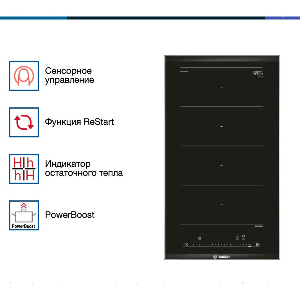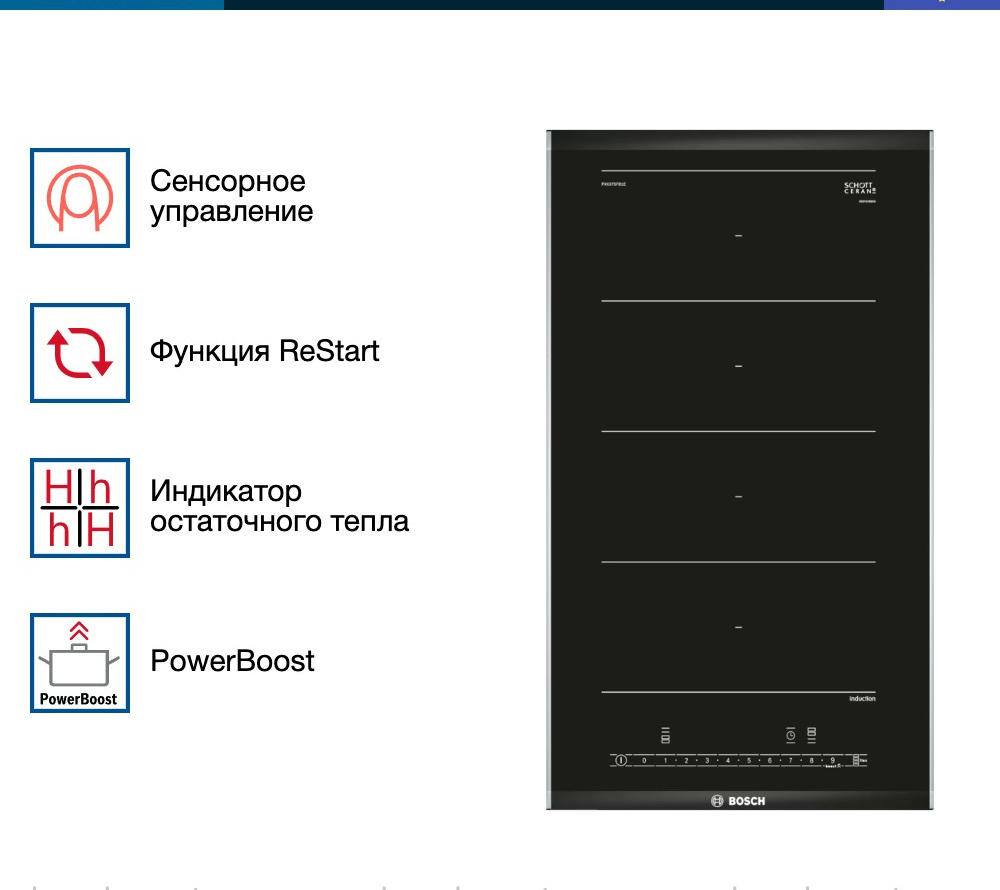 Но основными преимуществами данной панели являются функции ReStart, QuickStart и PowerBoost. Функция ReStart позволяет быстро возобновить приготовление пищи после случайного выключения, сохраняя все выбранные настройки. QuickStart ускоряет процесс нагрева конфорки, что сокращает время приготовления. PowerBoost значительно увеличивает мощность конфорки, что позволяет быстро довести воду до кипения или приготовить блюдо в короткие сроки.