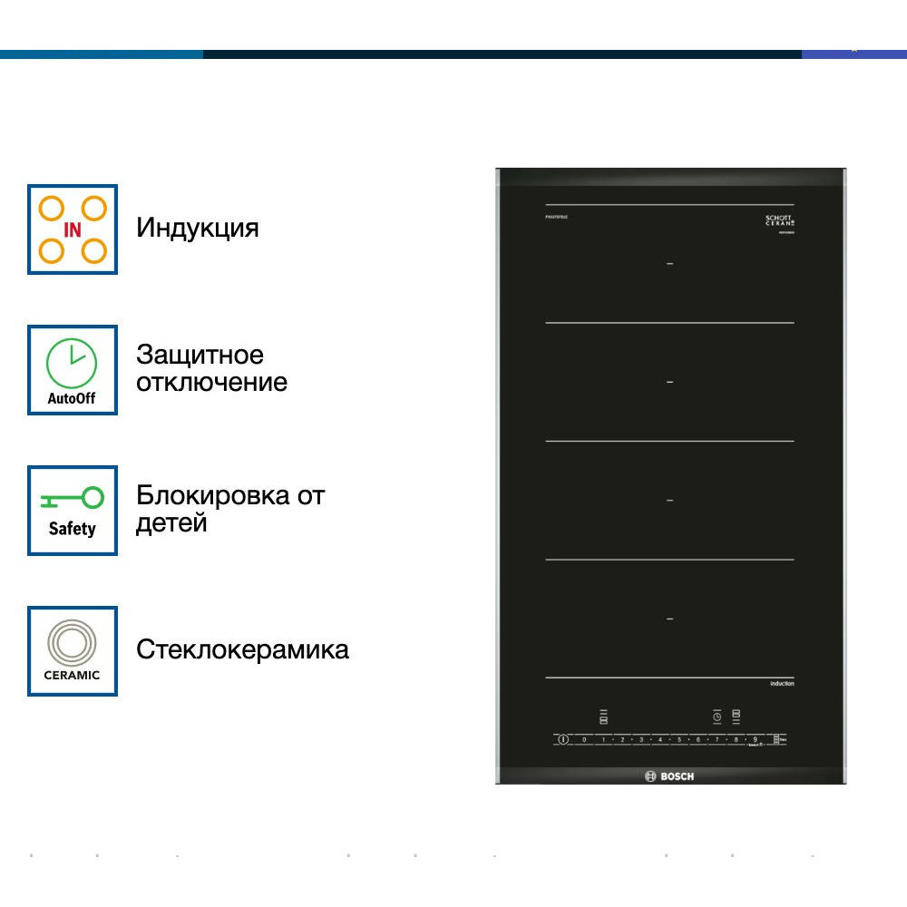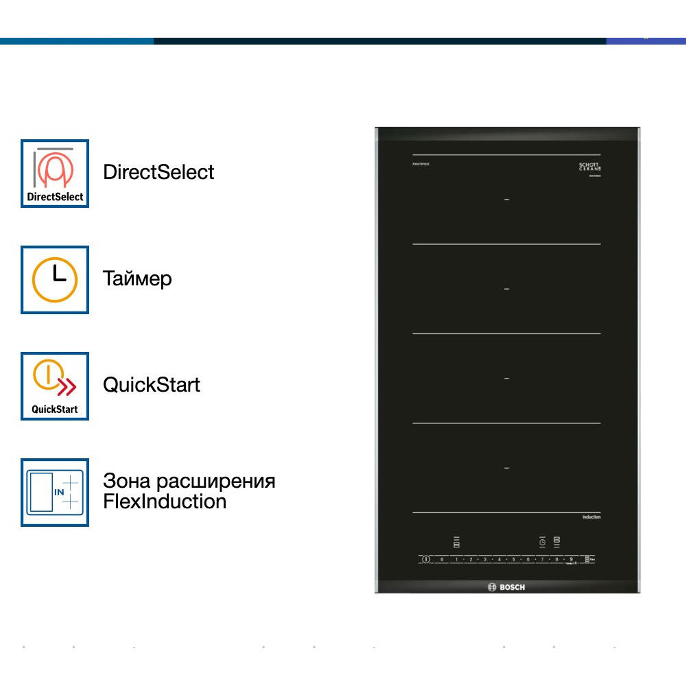 Кроме того, панель оснащена зоной расширения FlexInduction, которая позволяет использовать большую посуду или несколько маленьких сосудов одновременно. Панель также имеет главный выключатель, защитное отключение и блокировку от детей, что обеспечивает безопасность использования. Индикатор остаточного тепла для каждой конфорки позволяет избежать ожогов после использования панели.