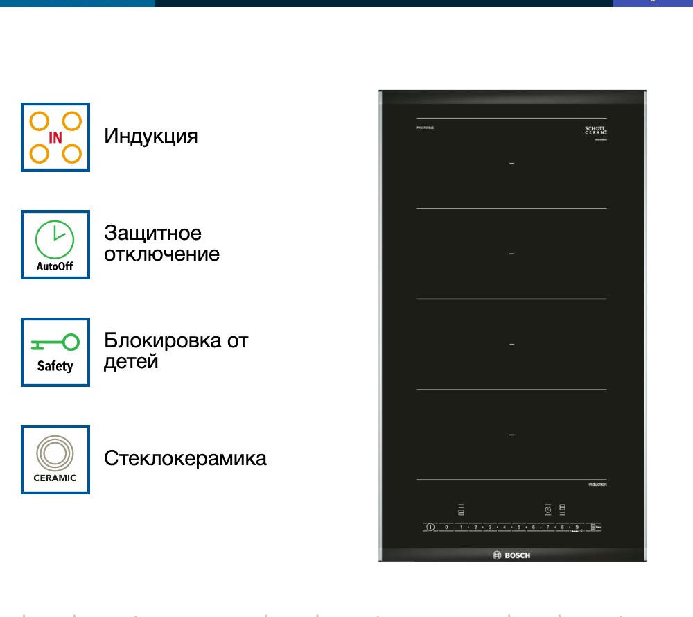 Варочная панель Bosch PXX375FB1E - это современное кухонное устройство, произведенное в Евросоюзе и обладающее множеством уникальных функций и технологий. Стильный дизайн, черный цвет и гладкая стеклокерамическая поверхность делают ее идеальным дополнением к любому интерьеру. Особенностью дизайна являются рамка по краям и скошенные края, что придает панели элегантность и современность. Сенсорные элементы управления и система DirectSelect обеспечивают удобство и простоту использования.