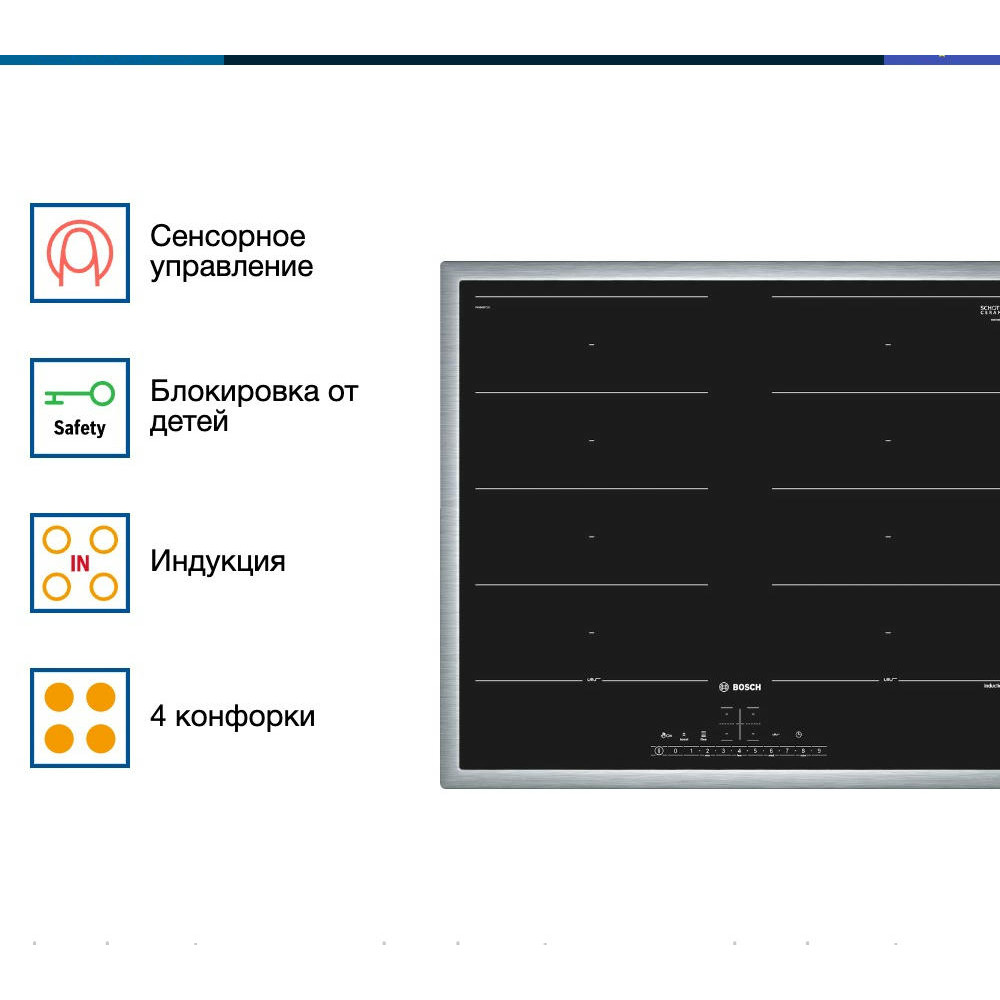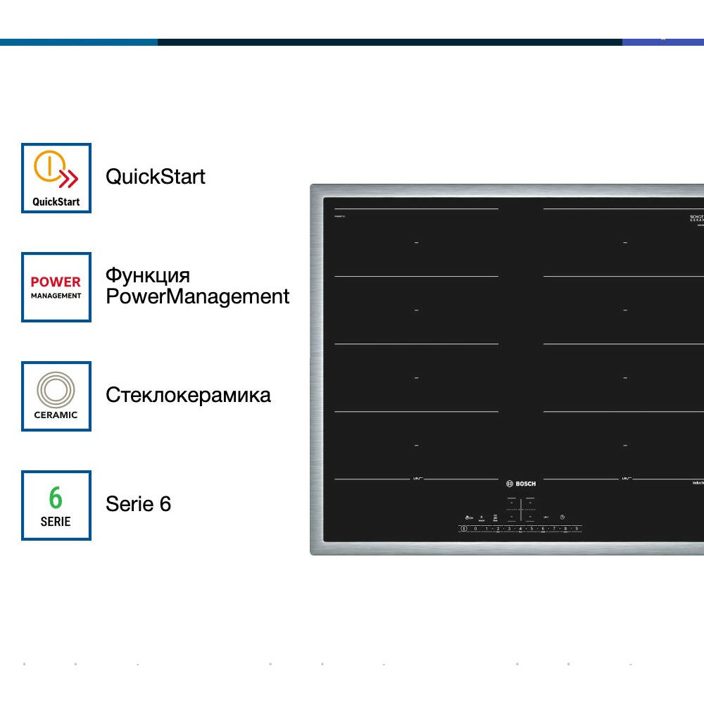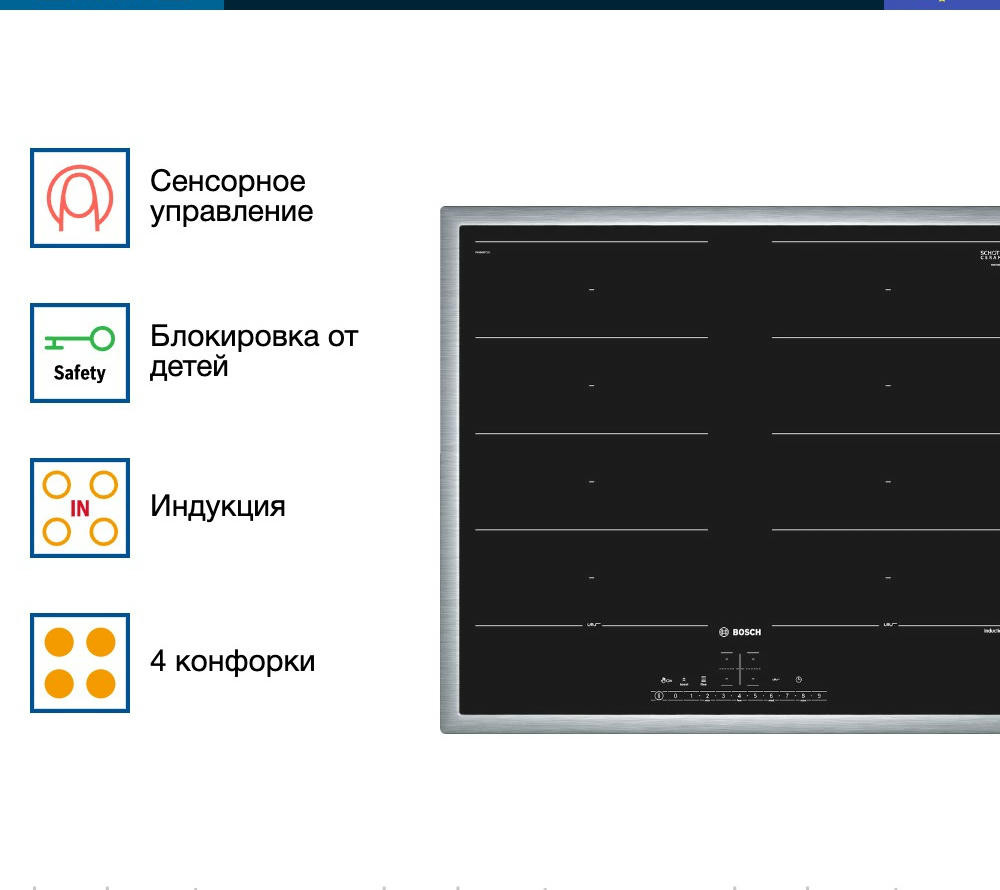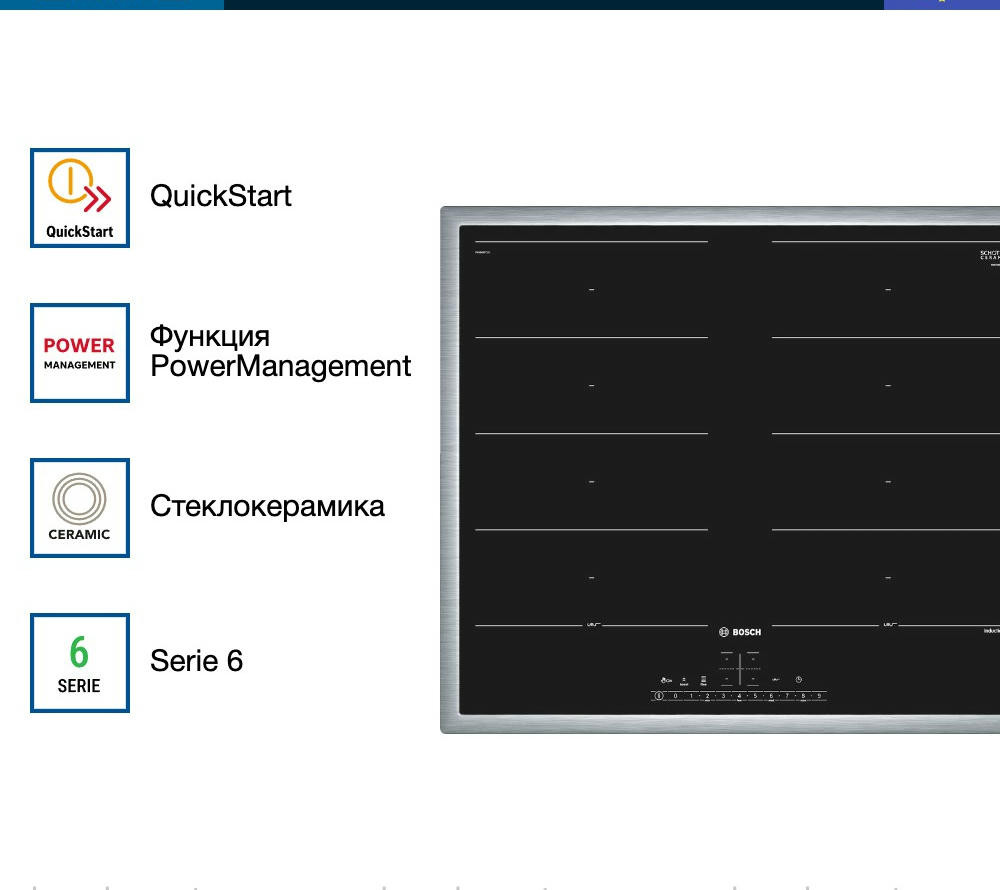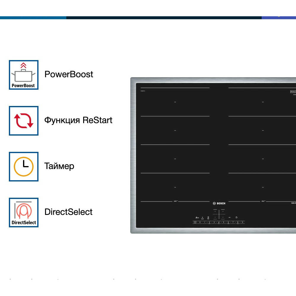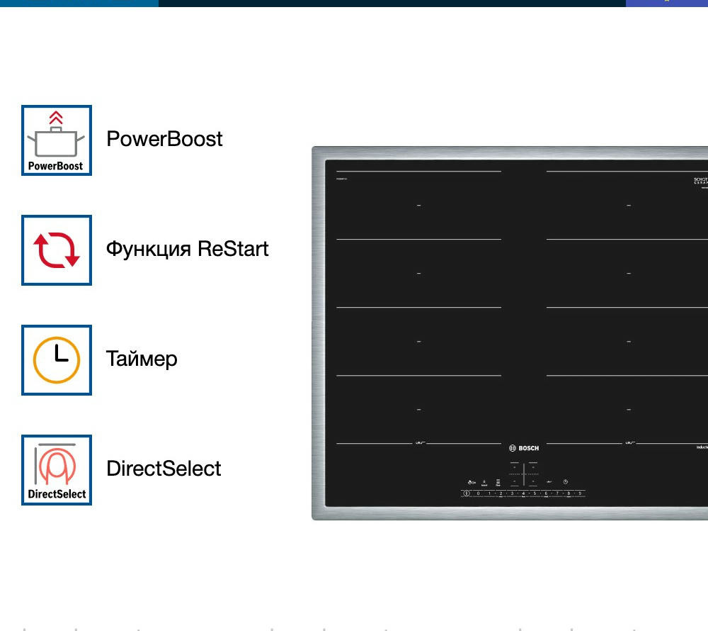 Варочная панель Bosch PXX645FC1E оснащена функцией Power Boost, она увеличивает мощность конфорки до 50 процентов, что позволяет быстрее вскипятить воду. Flex Induction объединяет две зоны нагрева в одну, это позволяет готовить в нестандартной посуде. Датчик PerfectFry контролирует процесс жарения, вам остается выбрать предустановленную температуру.