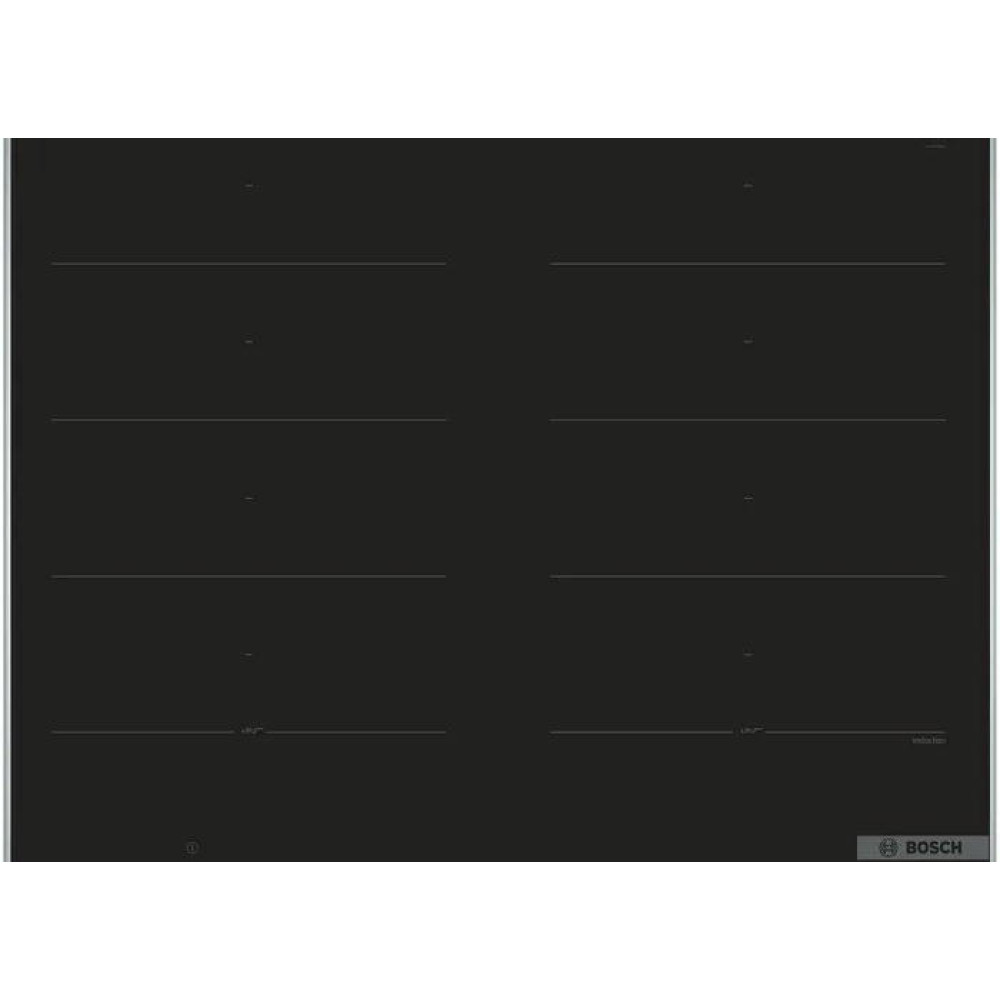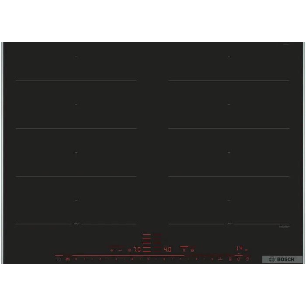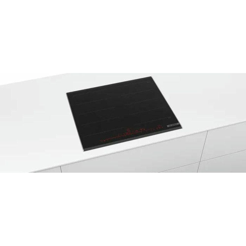 Варочная панель Bosch PXX675DC1E из линейки FlexInduction позволяет объединять четыре конфорки в две независимые или одну большую зону нагрева. Автоматически активируются только те индукторы, над которыми находится посуда, что минимизрует расход электроэнергии. Благодаря технологии Home Connect возможна удаленная диагностика.