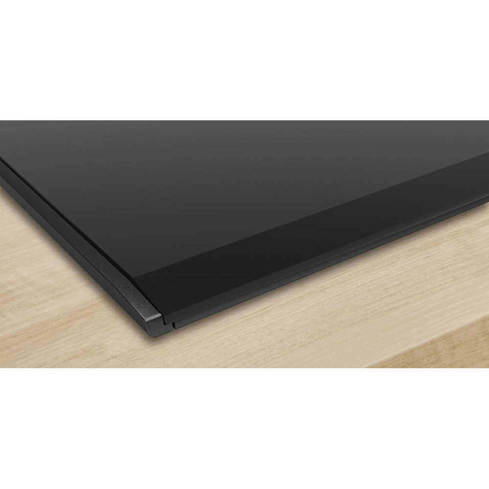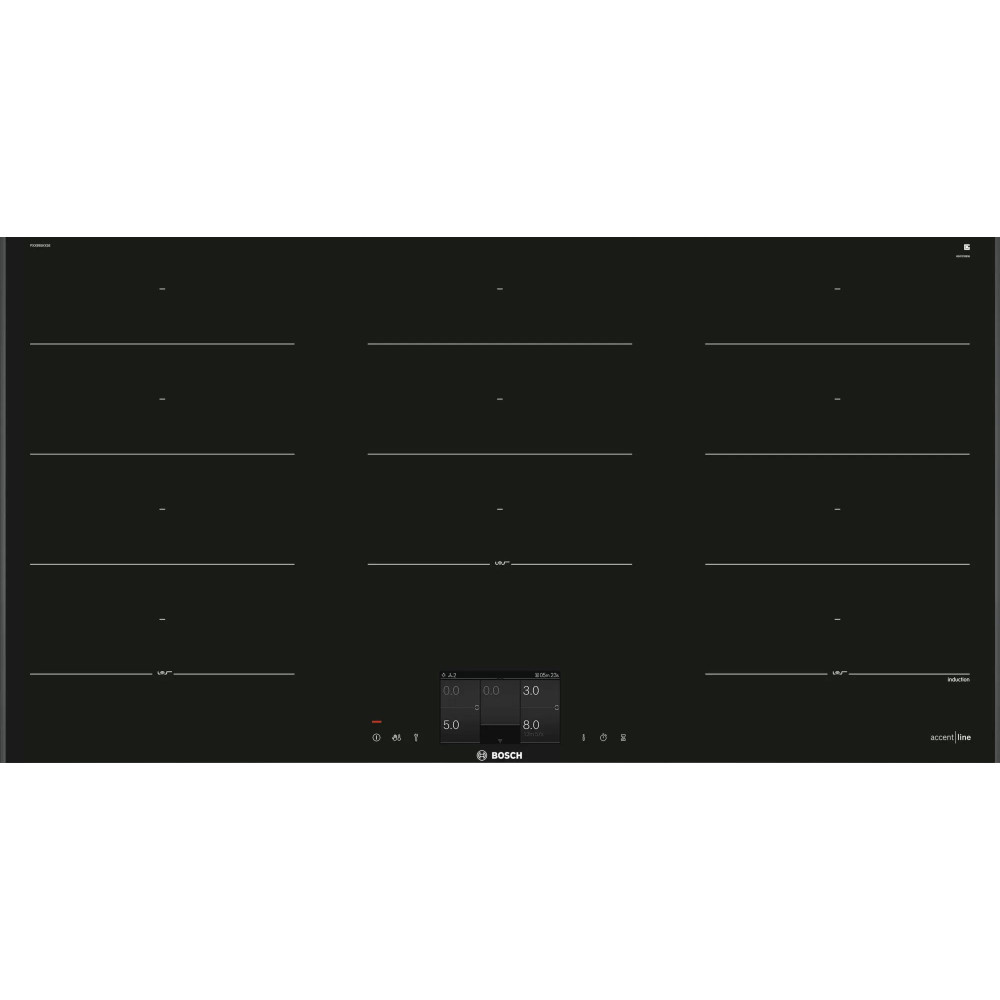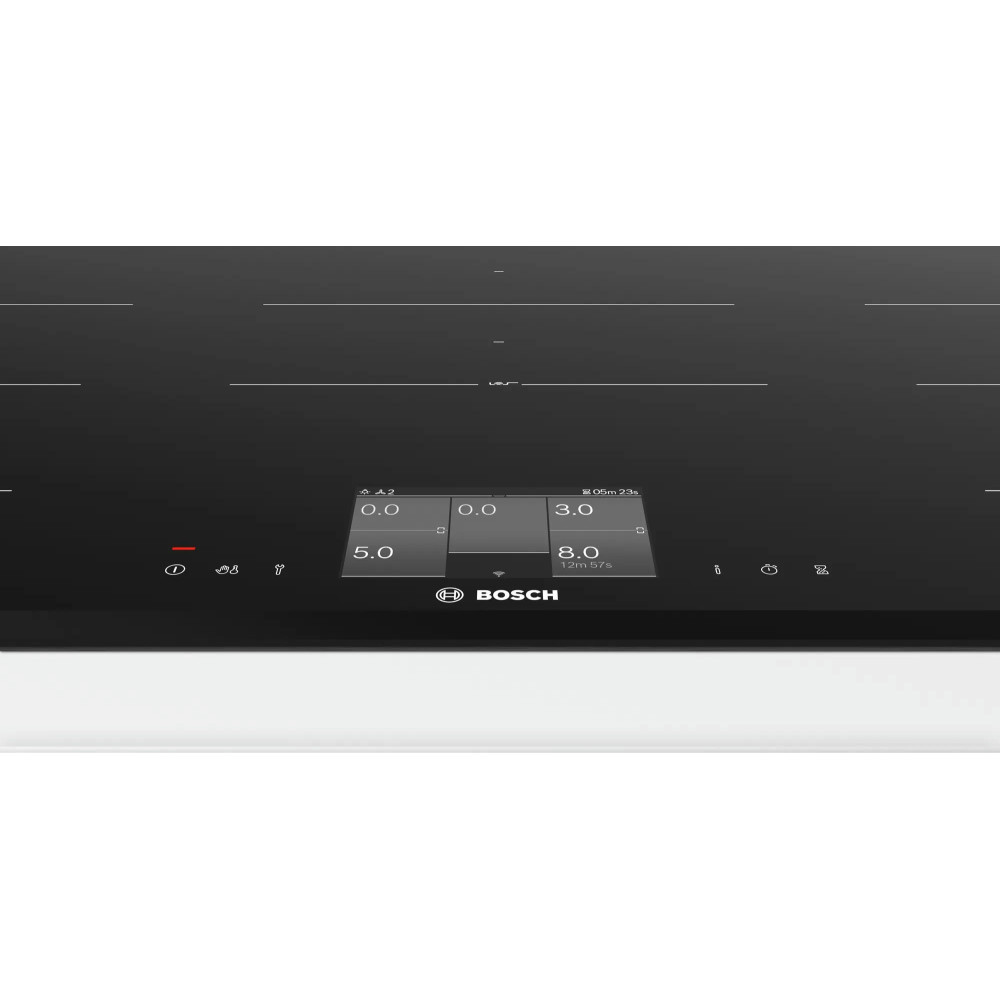 Индукционная варочная панель Bosch PXX995KX5E — это высококачественное устройство, которое сочетает в себе элегантность дизайна и функциональность. Выполненная в строгом черном цвете, она идеально впишется в любой интерьер кухни, добавляя ему изысканности и стиля. Материал поверхности панели — стеклокерамика, что придает ей не только привлекательный внешний вид, но и обеспечивает простоту в уходе. Скошенный край и металлический профиль по бокам подчеркивают модернистский дизайн и делают панель удобной в использовании. Управление варочной панелью осуществляется с помощью сенсорных элементов, что делает процесс приготовления пищи еще более комфортным. Система управления FullTouch и TFT дисплей обеспечивают простоту и интуитивность настроек, позволяя вам легко контролировать процесс приготовления пищи. Данная модель оборудована пятью конфорками, что позволяет приготовить несколько блюд одновременно. Каждая из конфорок имеет 17 ступеней мощности, что позволяет точно настроить температуру для приготовления различных блюд. Особенностью данной модели является функция распознавания посуды, которая автоматически определяет размер и форму посуды и соответственно регулирует зону нагрева. Также варочная панель оснащена тремя зонами расширения FlexInduction, которые позволяют использовать посуду различных размеров и форм. Варочная панель Bosch PXX995KX5E оборудована множеством полезных функций, таких как PanBoost, ReStart, QuickStart, PowerBoost, PowerManagement, поддержание тепла, MoveMode, а также сенсоры PerfectCook и PerfectFry с 5 температурными диапазонами. Все эти функции делают процесс приготовления пищи максимально простым и удобным.