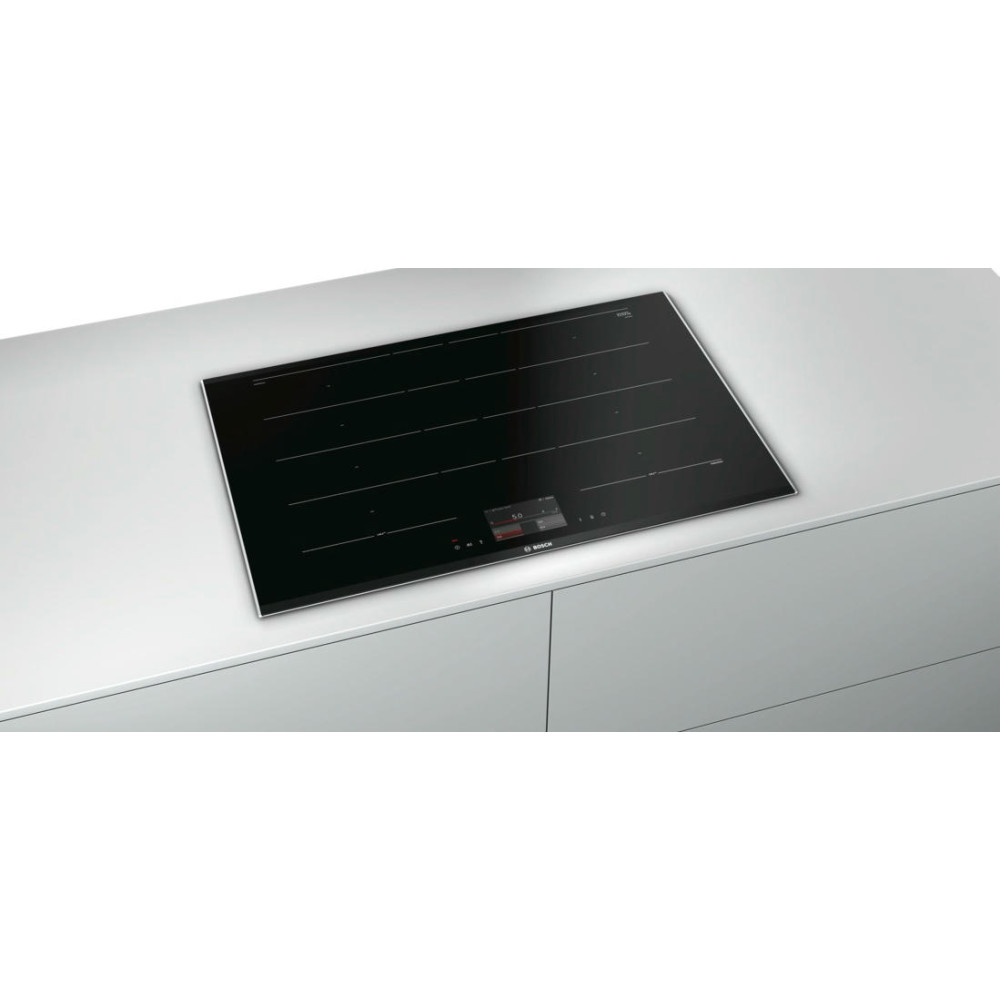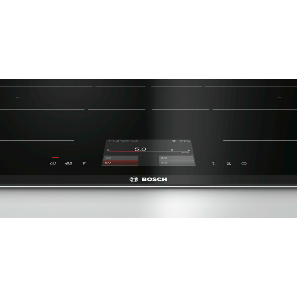 Индукционная варочная панель Bosch PXY875KE1E — усовершенствованная модель с расширенной зоной Extended FlexInduction и сенсорным управлением FullTouch с TFT-дисплеем. Вы можете готовить в любом месте варочной поверхности, функция автоматического распознавания посуды дает еще больше возможностей для использования посуды больших размеров.