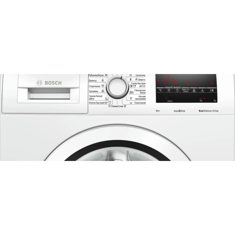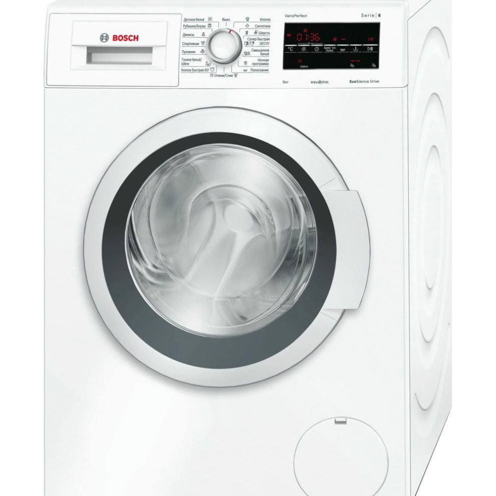 У стиральной машины Бош WAT20441OE 15 программ, в которых автоматически прописаны настройки для стирки разных видов ткани. Предустановленные параметры есть для стирки шерсти, хлопка, шелка, тонкого белья, рубашек или пуховиков, спортивной или детской одежды.