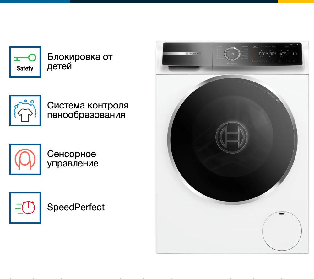 Скорость отжима достигает 1400 оборотов в минуту, обеспечивая эффективное удаление влаги из белья. Управление стиральной машиной осуществляется с помощью сенсорных элементов и многофункционального LED-дисплея. На дисплее отображается информация о ходе программы, времени до окончания стирки и максимальной загрузке для выбранной программы. Также предусмотрена функция отложенного старта, позволяющая настроить время начала стирки на удобное для вас время. Bosch WGB24400ME оснащена 14 программами стирки, включая предварительную стирку, стирку хлопка, синтетики, смешанного белья и деликатных тканей.