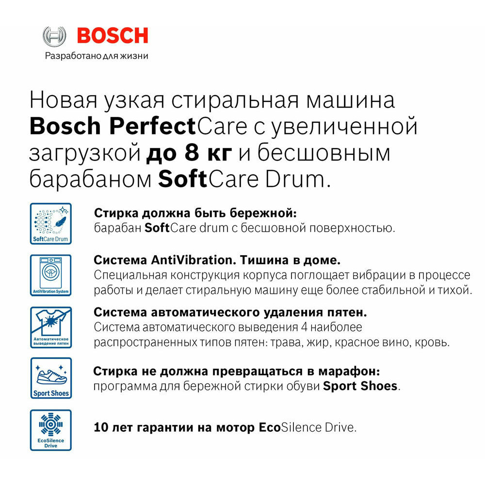 Bosch WHA232X1OE имеет в своей конструкции барабан SoftCare с бесшовной поверхностью, что позволяет достигать наилучших результатов в стирке. Функция AntiStain удалит один из 4-х наиболее стойких видов пятен по вашему выбору (трава, жир, кровь, красное вино). Программа для стирки спортивной обуви Sport Shoes увеличивает количество воды и снижает обороты барабана, чтобы предотвратить повреждения.