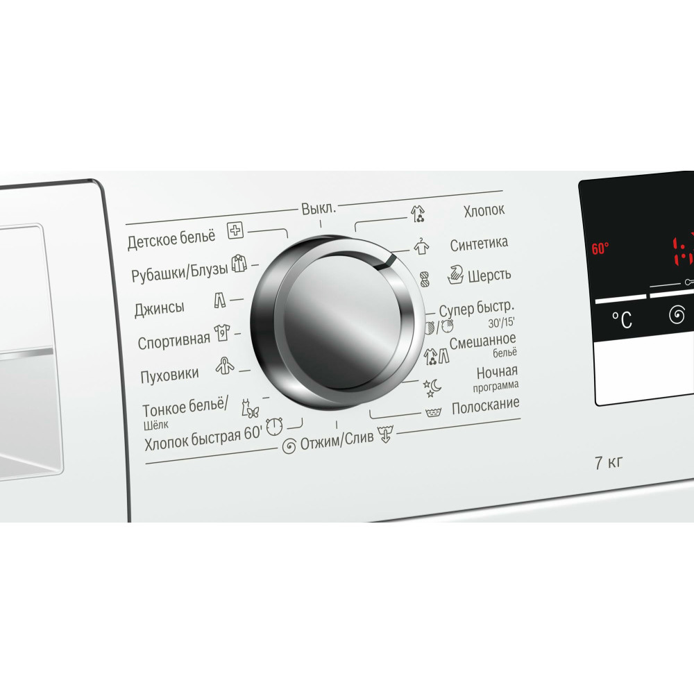 Максимальная загрузка барабана в Бош WLL24262OE составляет 7 кг белья. Основные программы предназначены для: