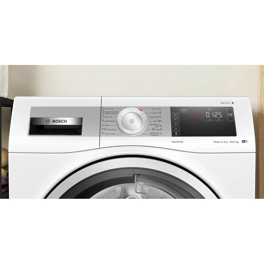 Стирально-сушильная машина Bosch WDU8H542EU отличается элегантным белым цветом и компактными размерами, что позволяет ей гармонично вписаться в любой интерьер. Модель оснащена удобным многофункциональным LED-дисплеем и сенсорными элементами управления, что обеспечивает простоту и удобство использования.