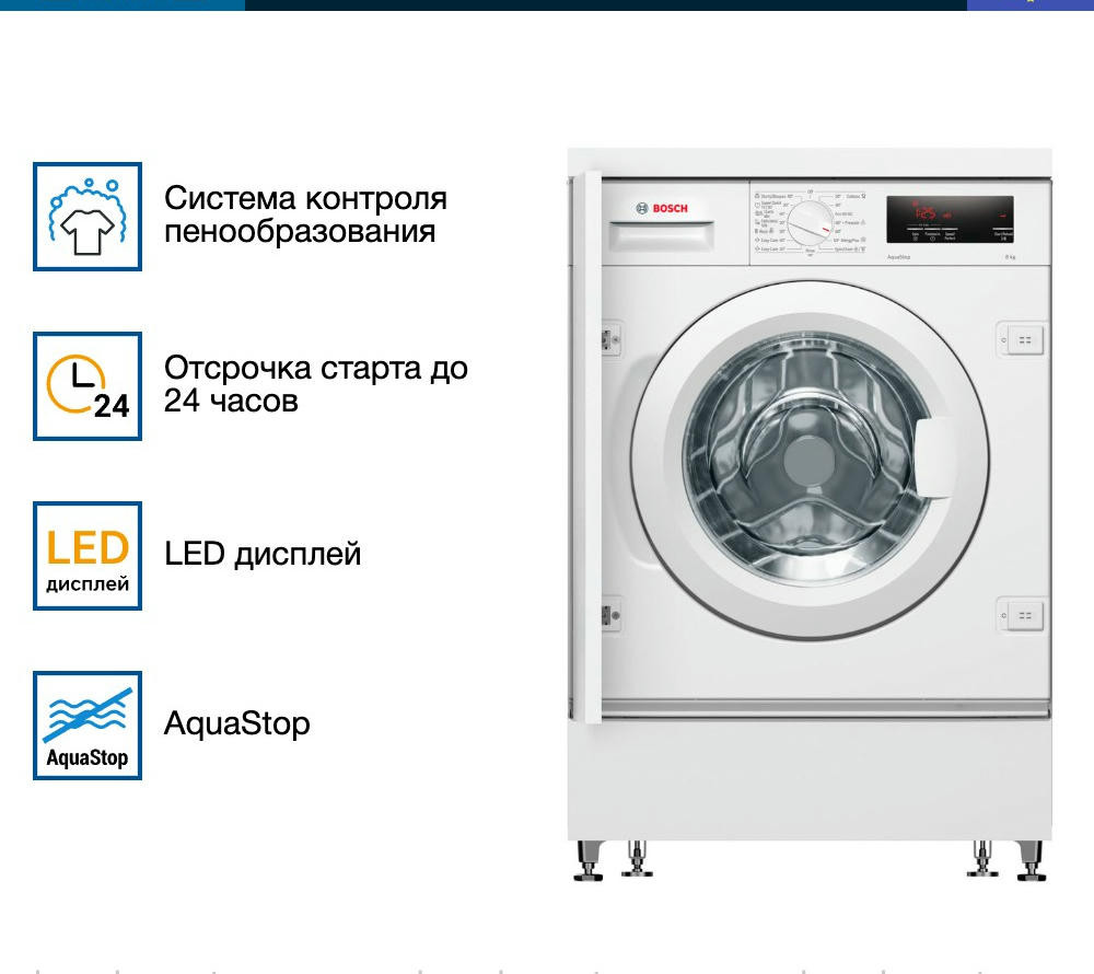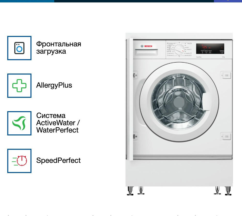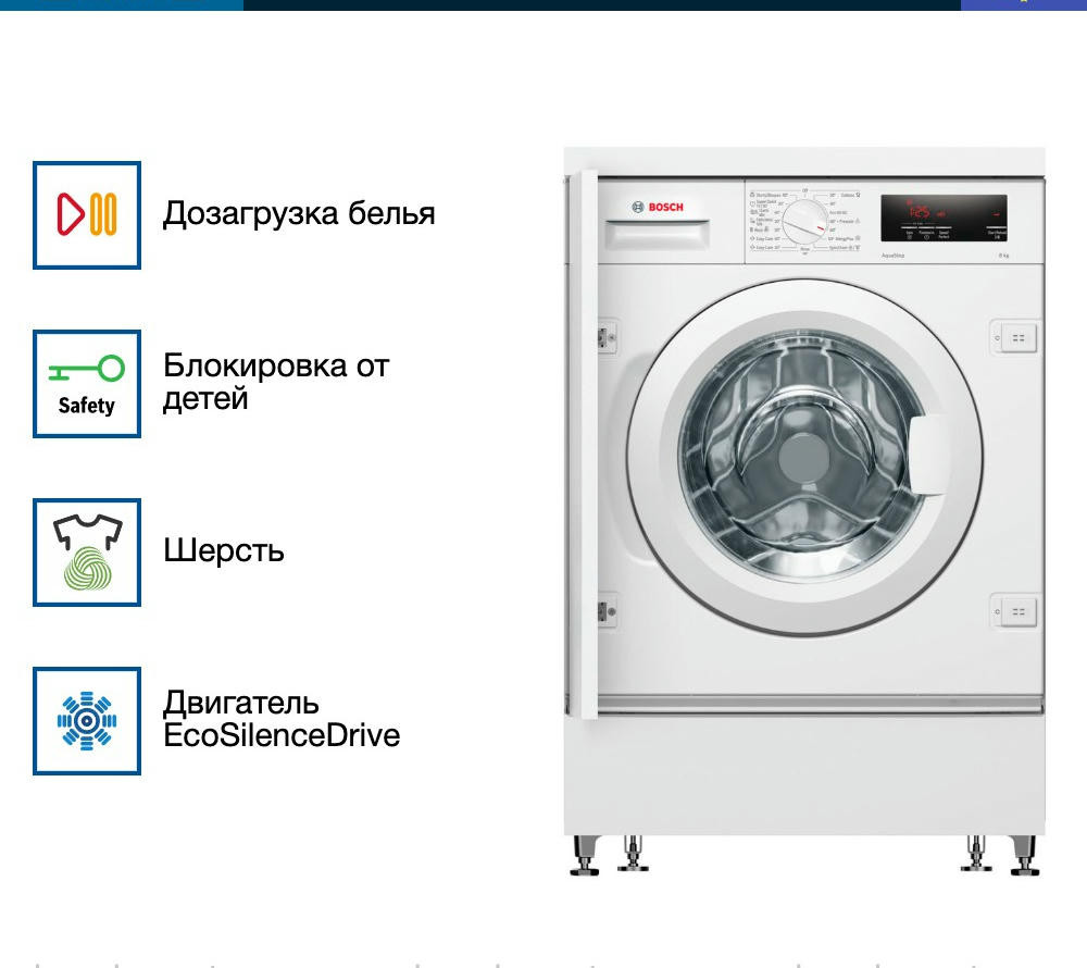 Встраиваемая стиральная машина Bosch WIW24342EU требуется довольно небольшая ниша: около 81.8 x 59.6 x 57.4. Машинка имеет 16 встроенных программ для стирки разных типов тканей в вариативных режимах. Так, можно стирать хлопок и синтетику на различных температурных параметрах, шерсть, смешанное белье. собенно хорошо в этой модели то, что мотор здесь сделан по новейшей технологии и работает бесшумно. Это двигатель EcoSilence Drive, который работает по бесщеточной схеме. Так как нет щеток, то нет и шума, который они могут производить. А в режиме ночной стирки шум еще больше снижается.