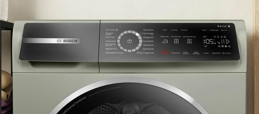 Максимальная загрузка составляет 9 кг, что позволяет сушить большое количество белья за один цикл. Электронное управление с сенсорными элементами Touch control обеспечивает простоту и удобство использования. На LED-дисплее отображается вся необходимая информация, включая индикацию заполнения ворсового фильтра и контейнера для конденсата. Одной из особенностей модели является функция отложенного старта до 24 часов, позволяющая запланировать сушку на удобное время. В ассортименте 14 программ сушки, включая специальные режимы для хлопка, синтетики, рубашек, спортивной одежды, тонкого и смешанного белья, полотенец, шерсти и деликатного белья. С помощью функции AutoDry можно автоматически установить оптимальное время сушки.