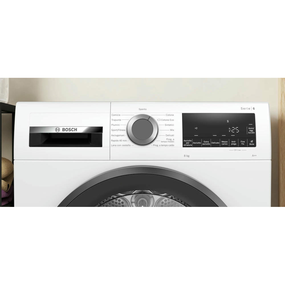 Сушильная машина Bosch WQG23100IT обладает антивибрационным дизайном, боковые стенки по бокам гасят вибрацию при работе. Имеется быстрая программа, которая за 40 минут высушит небольшие количества вещей. Система Auto Dry автоматически определяет сухость и влажность вещей, благодаря температурным датчикам.