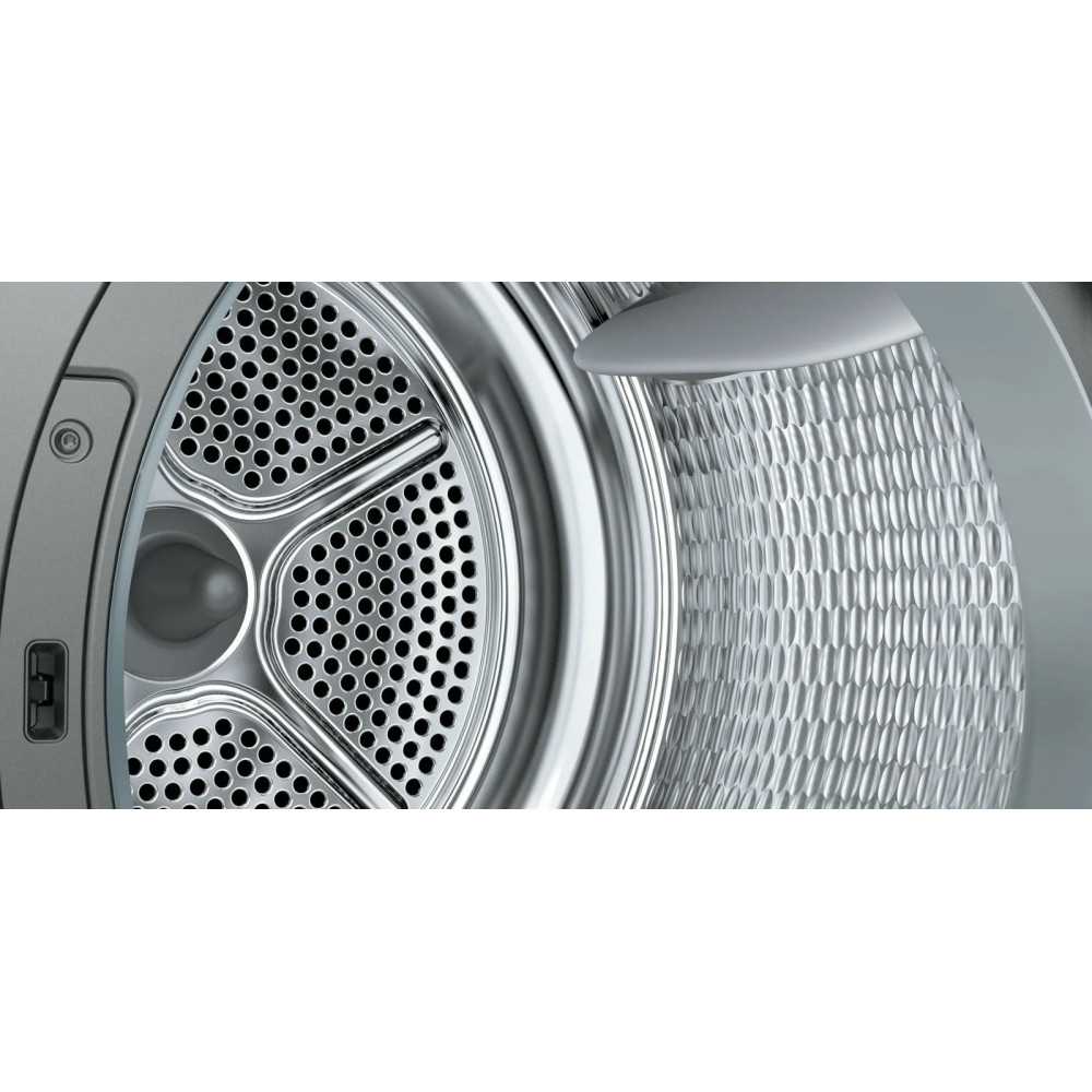 Материал барабана - нержавеющая сталь, что гарантирует долговечность и надежность машины. Двигатель с инверторным управлением обеспечивает тихую и эффективную работу. Контейнер для конденсата и ворсовый фильтр обеспечивают легкость обслуживания и чистоту процесса сушки. Модель также оснащена защитой от детей и дизайном боковой панели AntiVibration, что делает ее безопасной и стабильной в использовании. Класс энергопотребления А+++ гарантирует экономичность использования машины.
