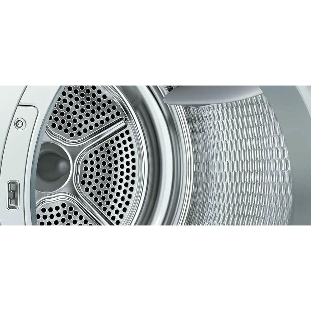 Машина оснащена 14 программами сушки, включая специальные режимы для хлопка, синтетики, рубашек, одеял, спортивной одежды, смешанного белья, полотенец, шерсти и деликатного белья. Функция AutoDry автоматически контролирует уровень влажности белья и прекращает сушку, как только достигнут необходимый результат. Благодаря функции отложенного старта можно запланировать начало работы машины на удобное для вас время в пределах 24 часов. Внутри машины установлен барабан из нержавеющей стали объемом 112 литров, который обеспечивает равномерное распределение тепла и бережное обращение с бельем. Двигатель с инверторным управлением гарантирует мягкий и плавный ход барабана, снижая уровень шума и вибрации. Дизайн боковой панели AntiVibration также способствует снижению вибрации и обеспечивает стабильность работы машины. В устройстве предусмотрена защита от детей, что делает его использование максимально безопасным. Машина обладает классом энергопотребления A++, что свидетельствует о ее высокой энергоэффективности.