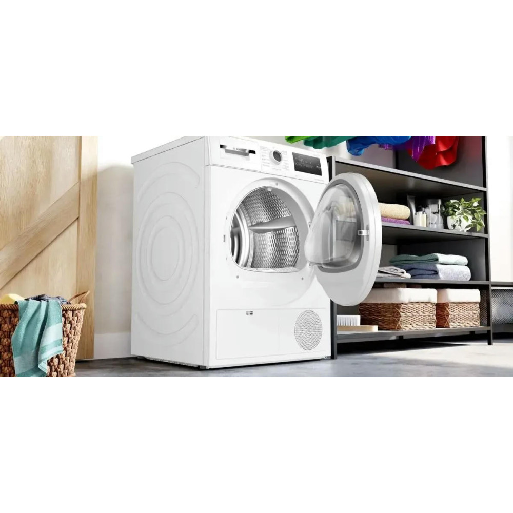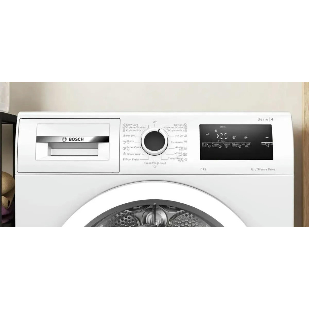 Сушильная машина Bosch WTN86201ME оборудована 13 программами сушки, включая сушку хлопка, синтетики, спортивной одежды, смешанного белья, шерсти и деликатного белья. Особенностью является наличие специализированных программ, таких как сушка пуховиков, функция AutoDry, Allergy Plus/Hygiene и супербыстрая сушка. Функция Iron Dry позволяет сушить белье до состояния "готово к утюжке", что значительно экономит время на глажке.