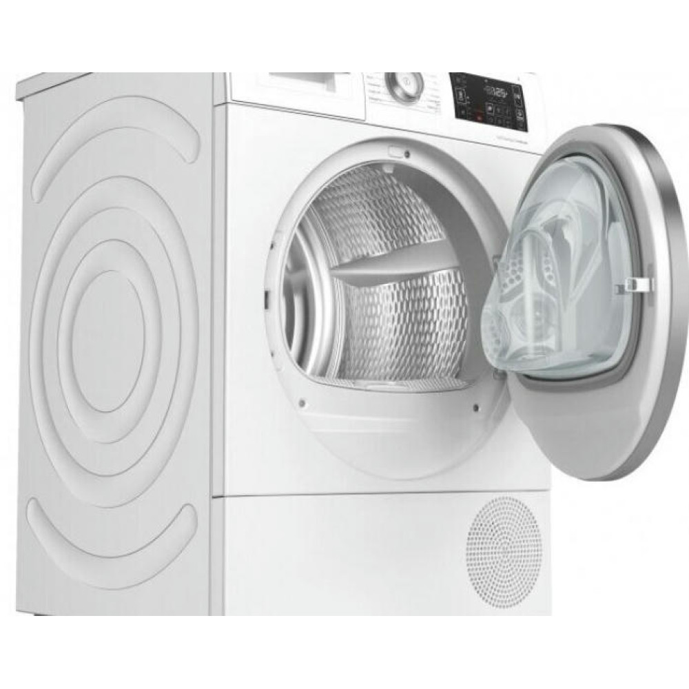 Сушильная машина Bosch WTU876BHSN оснащена функцией Home Connect, которая позволяет дистанционно запустить программу, проверить режим работы или провести удалённую диагностику прибора. С помощью системы SensitiveDrying белье обдувается мягким и теплым воздухом, поступающим со всех сторон, и мягко перемешивается, благодаря асимметричным захватам в барабане. В результате высушенное белье будет мягким, пушистым и без складок. Дизайн AntiVibration предполагает наличие специальных ламелей и выштамповок на корпусе, которые снижают уровень вибрации.