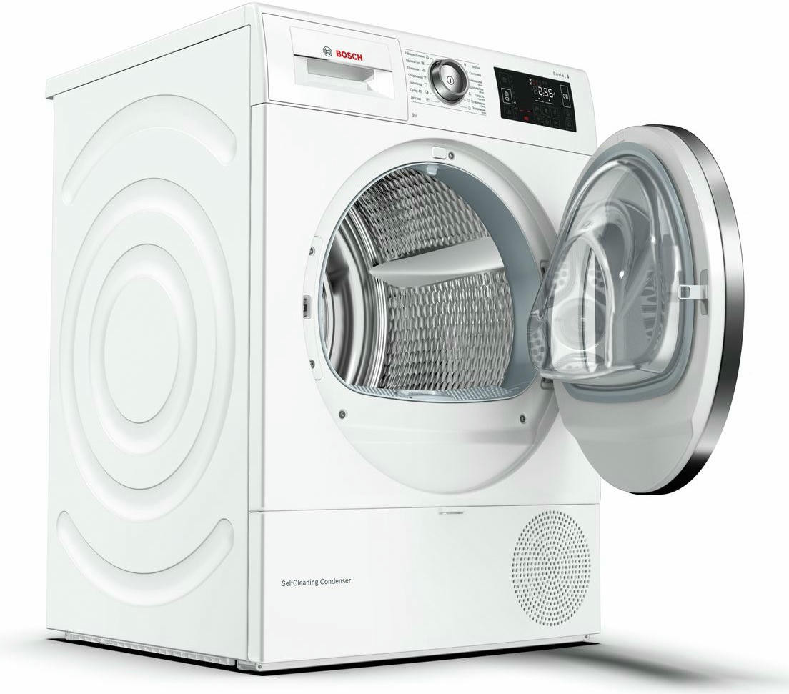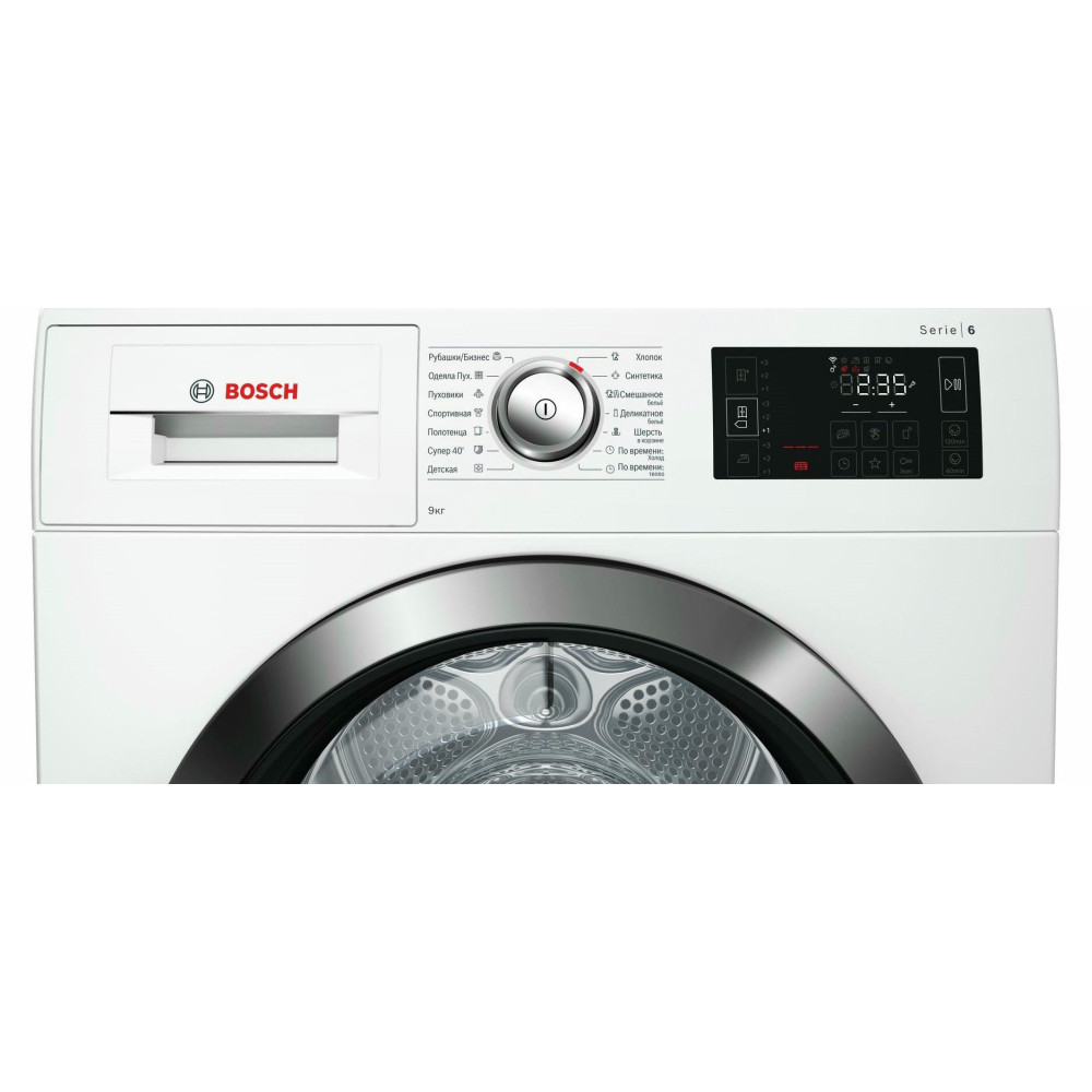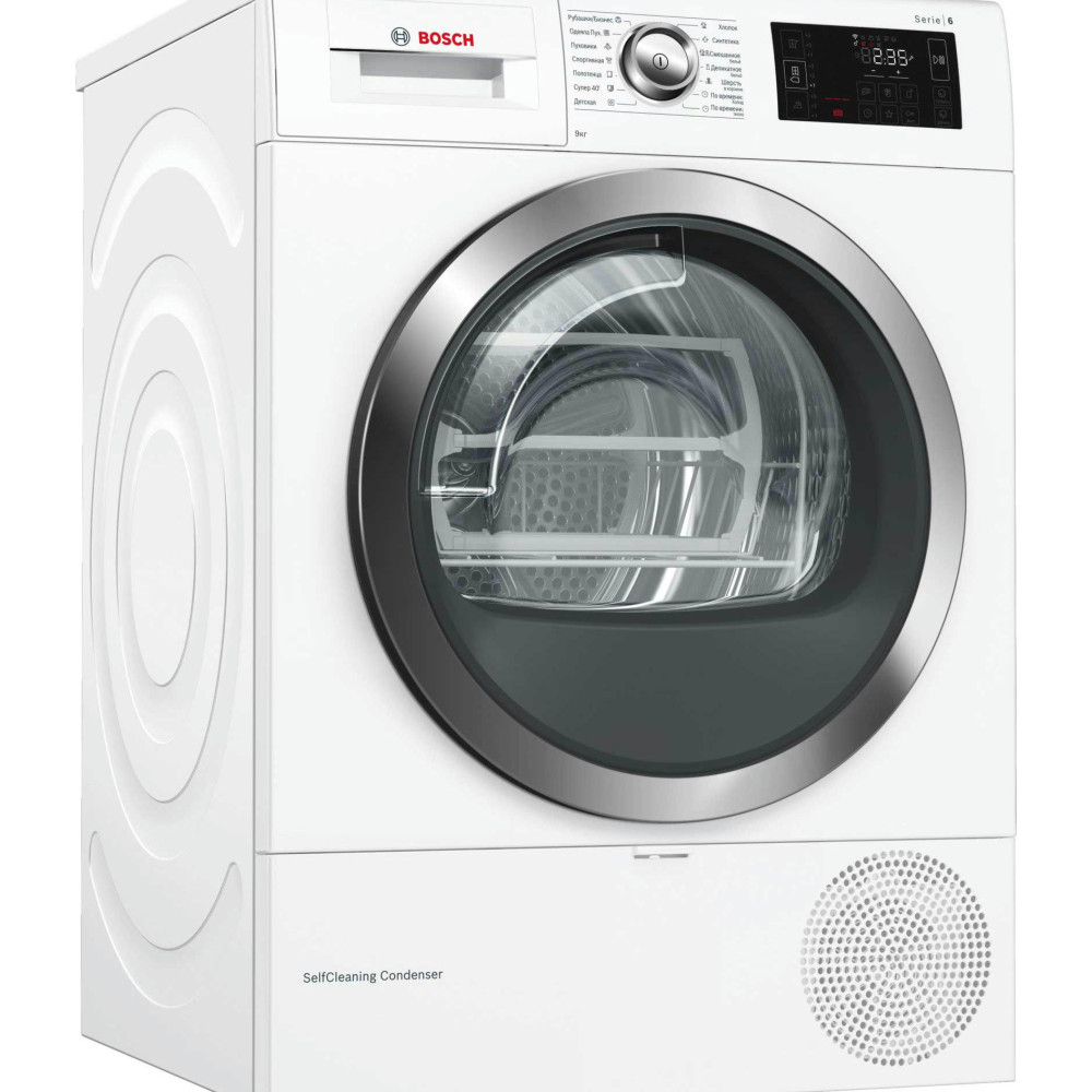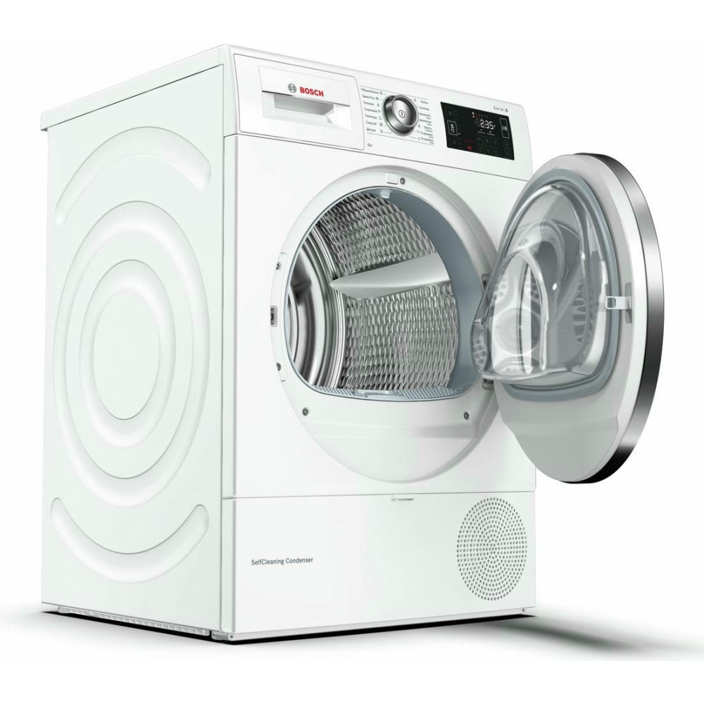 BOSCH WTW876H0OE имеет конденсационный тип сушки с применением теплового насоса, что значительно увеличивает эффективность процесса и снижает потребляемый расход энергии. Стандартный двигатель, проверенный временем, не дает сбоев. Максимальная загрузка составляет 9 кг. Класс энергоэффективности A++ позволит сократить траты на электричество. Электронное управление осуществляется по средствам поворотных переключателей и сенсорных клавиш Touch control. Большой многофункциональный LED-дисплей отображает необходимую информацию о работе. Барабан выполнен из нержавеющей стали устойчивой к воздействию влаги и высоких температур. Отвод конденсата может осуществляться напрямую в канализацию. По завершении цикла вы услышите приятный звуковой сигнал. Максимальное время отсрочки старта составляет 24 часа. В стандартный комплект входят корзина для сушки шерсти, самоочищающийся конденсатор и ворсовый фильтр. Гарантия от производителя составляет 12 месяцев.