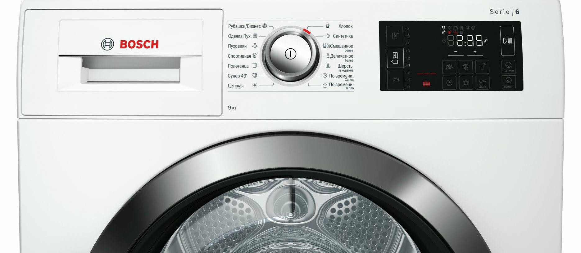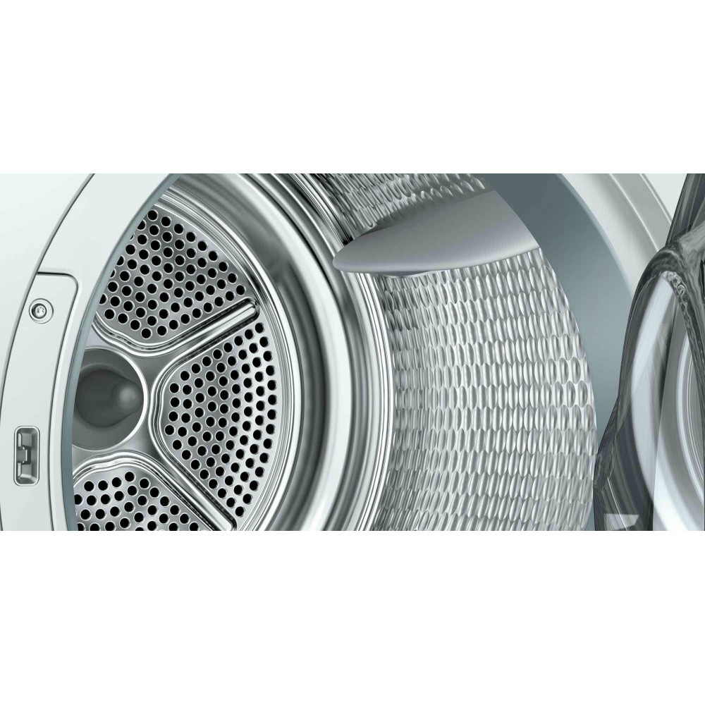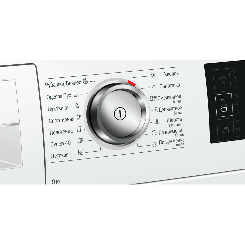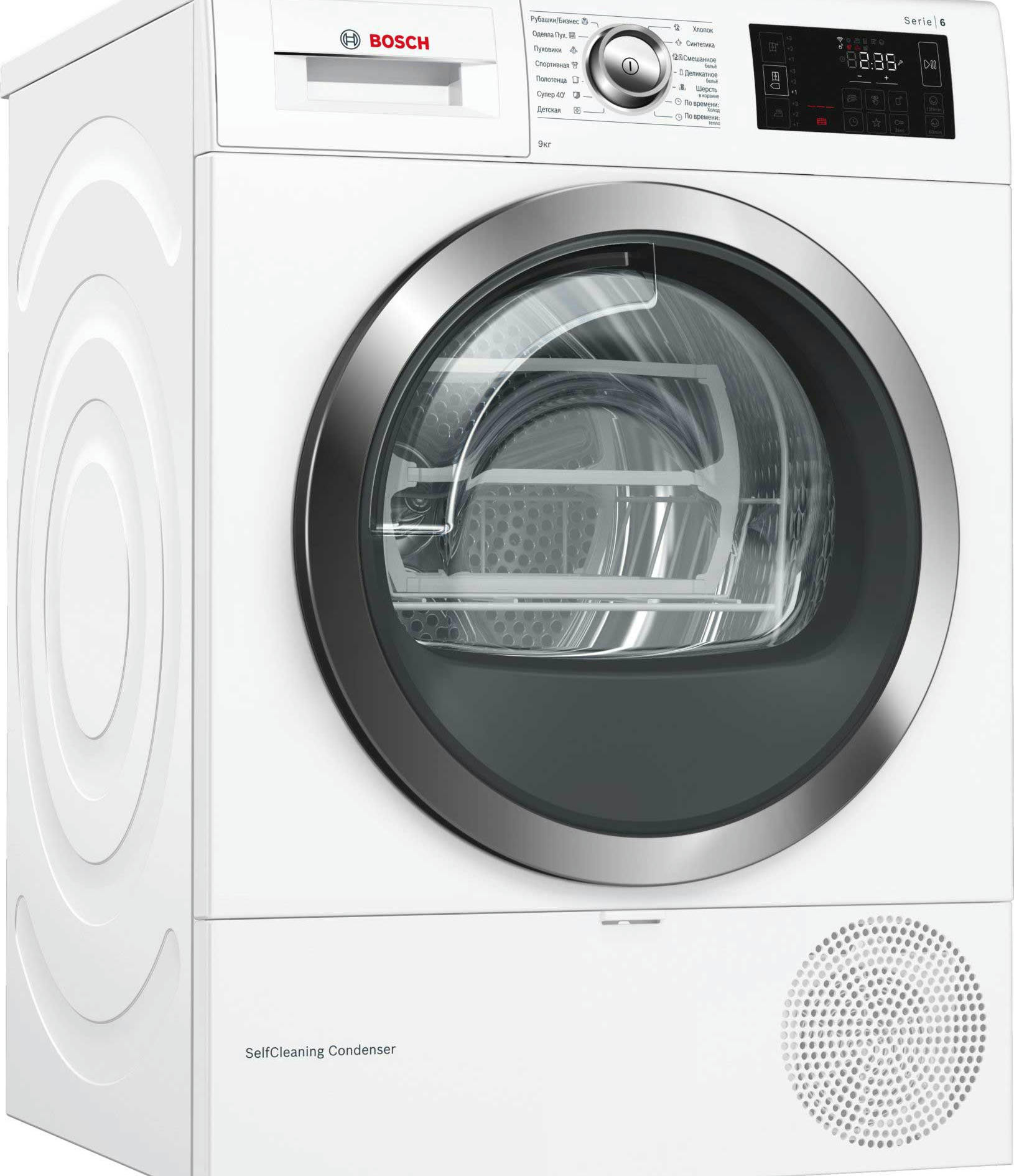 BOSCH WTW876H0OE имеет конденсационный тип сушки с применением теплового насоса, что значительно увеличивает эффективность процесса и снижает потребляемый расход энергии. Стандартный двигатель, проверенный временем, не дает сбоев. Максимальная загрузка составляет 9 кг. Класс энергоэффективности A++ позволит сократить траты на электричество. Электронное управление осуществляется по средствам поворотных переключателей и сенсорных клавиш Touch control. Большой многофункциональный LED-дисплей отображает необходимую информацию о работе. Барабан выполнен из нержавеющей стали устойчивой к воздействию влаги и высоких температур. Отвод конденсата может осуществляться напрямую в канализацию. По завершении цикла вы услышите приятный звуковой сигнал. Максимальное время отсрочки старта составляет 24 часа. В стандартный комплект входят корзина для сушки шерсти, самоочищающийся конденсатор и ворсовый фильтр. Гарантия от производителя составляет 12 месяцев.