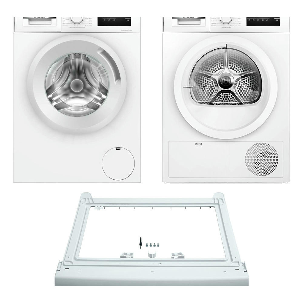 Комплект бытовой техники Bosch Serie 4 WAN280L5SN + WTH85VL5SN + WTZ20410 является идеальным решением для тех, кто ценит качество, надежность и функциональность. Произведенный в Евросоюзе, этот комплект включает в себя стиральную и сушильную машины, а также соединительный элемент, который обеспечивает их гармоничное сосуществование в пространстве вашего дома. Белоснежное исполнение придает комплекту элегантный и современный вид. Все элементы имеют универсальные размеры (ширина — 59.8 см, высота — 84.8 и 84.2 см соответственно), что позволяет установить их практически в любом помещении. Основные управляющие элементы выполнены в виде кнопок и поворотных переключателей, обеспечивая простоту и удобство использования.